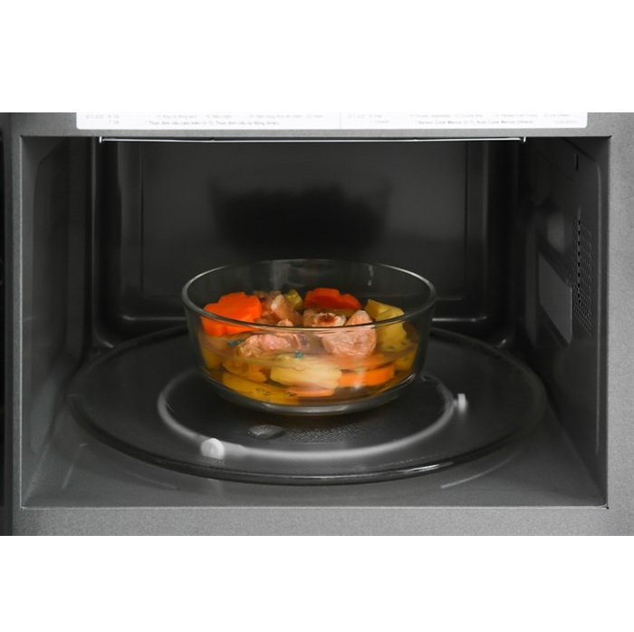 Lò vi sóng dung tích 20 lít, có thể bỏ vừa gà nguyên con 1kg Công suất vi sóng tối đa 1270W, nướng tới 1000W nấu nhanh Lò vi sóng có 4 chức năng chính:
