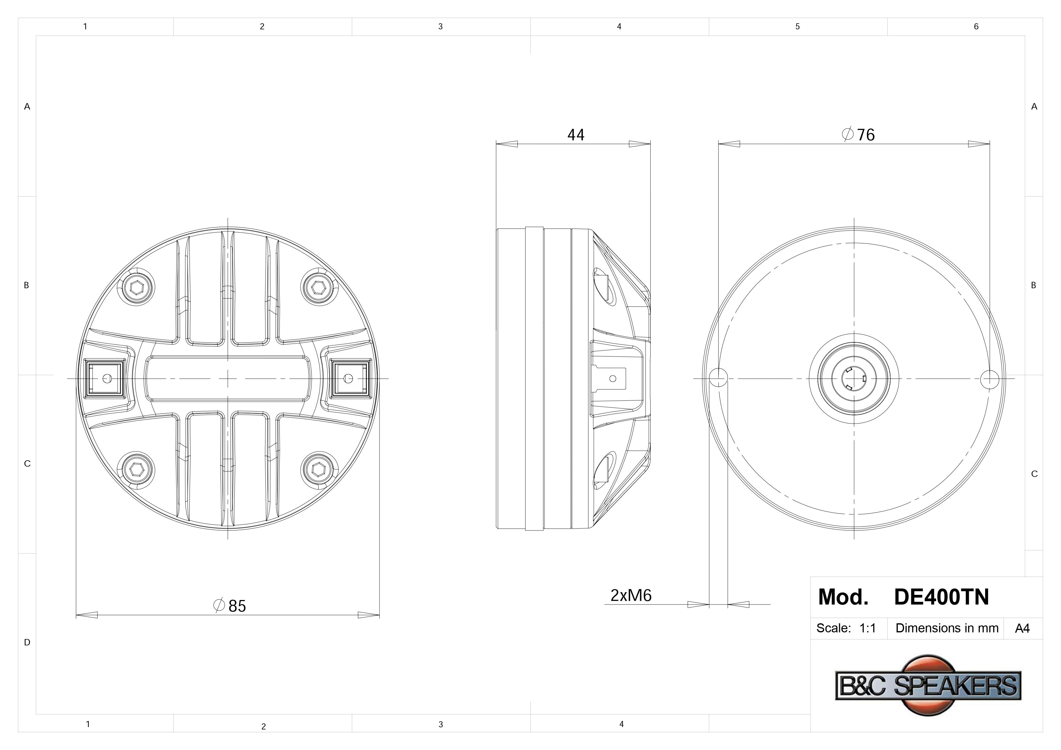 Loa Treble B&C SPEAKERS DE400TN – Hàng Chính Hãng Xuất xứ: Italia Sủ dụng họng 1 Inch ( ME45) Voice coil 44mm (1.7") Công suất: 100w Công suất đỉnh 200 W Dải tần: 1200