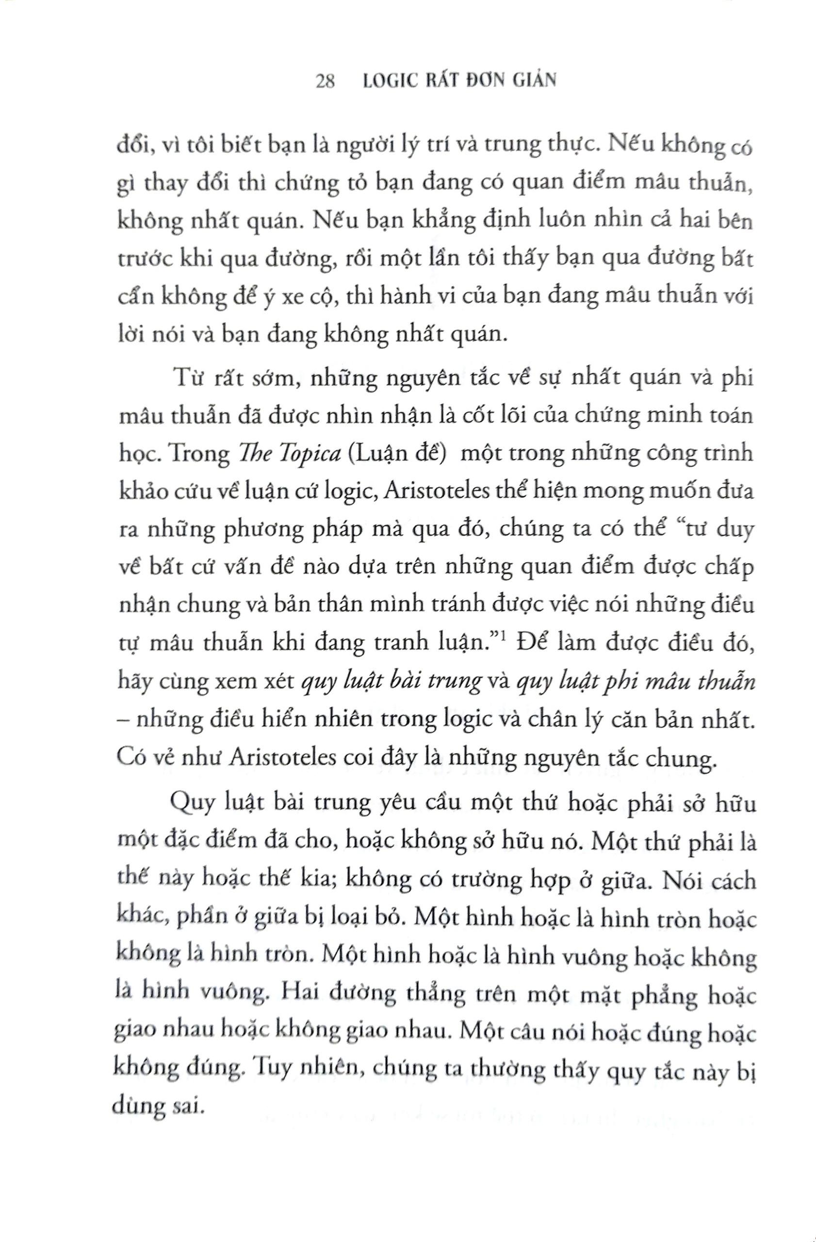 - Nếu một người mẹ nói với con: “Nếu ăn hết cơm, con có thể được ăn tráng miệng” thì có thực sự là trẻ phải ăn hết cơm thì mới được ăn tráng miệng? Đánh giá của chuyên gia, tổ chức uy tín về cuốn sách cùng các giải thưởng: “Đọc văn của Bennett… giống như một cuộc trò chuyện bên tách cà phê của những người trí thức sành sỏi… không gì có thể gợi mở và khiến độc giả hứng thú hơn.” – SIMON INGS, NEW SCIENTIST “Trong trường hợp này, bạn có thể đánh giá một cuốn sách qua bìa sách – hay chí ít là nhan đề: tác giả đã đưa ra lời hứa ở ngay từ đầu và thực hiện nó bằng cách khiến logic thật dễ hiểu đối với bạn đọc.” – MANYA CHYLINSKI, LIBRARY JOURNAL Trích đoạn hay : Tật khó tưởng tượng nếu các suy luận trong đời sống hằng ngày lại không dựa trên tư duy logic. Bác sĩ, cũng như thợ sửa ô tô, phải tư duy dựa trên các triệu chứng m.ình thấy. Cảnh sát điều tra và chuyên gia pháp y phải xử lý và tư duy logic từ các manh mối. Người dùng máy tính phải làm quen với các quy tắc logic mà máy móc được thiết kế để tuân theo. Các quyết định kinh doanh dựa trên phân tích logic tình hình thực tế và những bất ngờ có thể xảy ra. Về tác giả: Deborah J. Bennett dạy môn toán tại Đại học New Jersey City ở Jersey City, New Jersey được mệnh danh là “người giỏi xuất sắc” với trong biến các vấn đề trừu tượng trở nên “dễ hiểu và ấn tượng”. Trong cuốn sách này, tất cả lý thuyết, lịch sử và giai thoại đều được trình bày theo lối dễ hiểu và hài hước nhất. Logic rất đơn giản thực sự là cuốn sách hiếm hoi giúp bạn hiểu tường tận về tư duy logic.