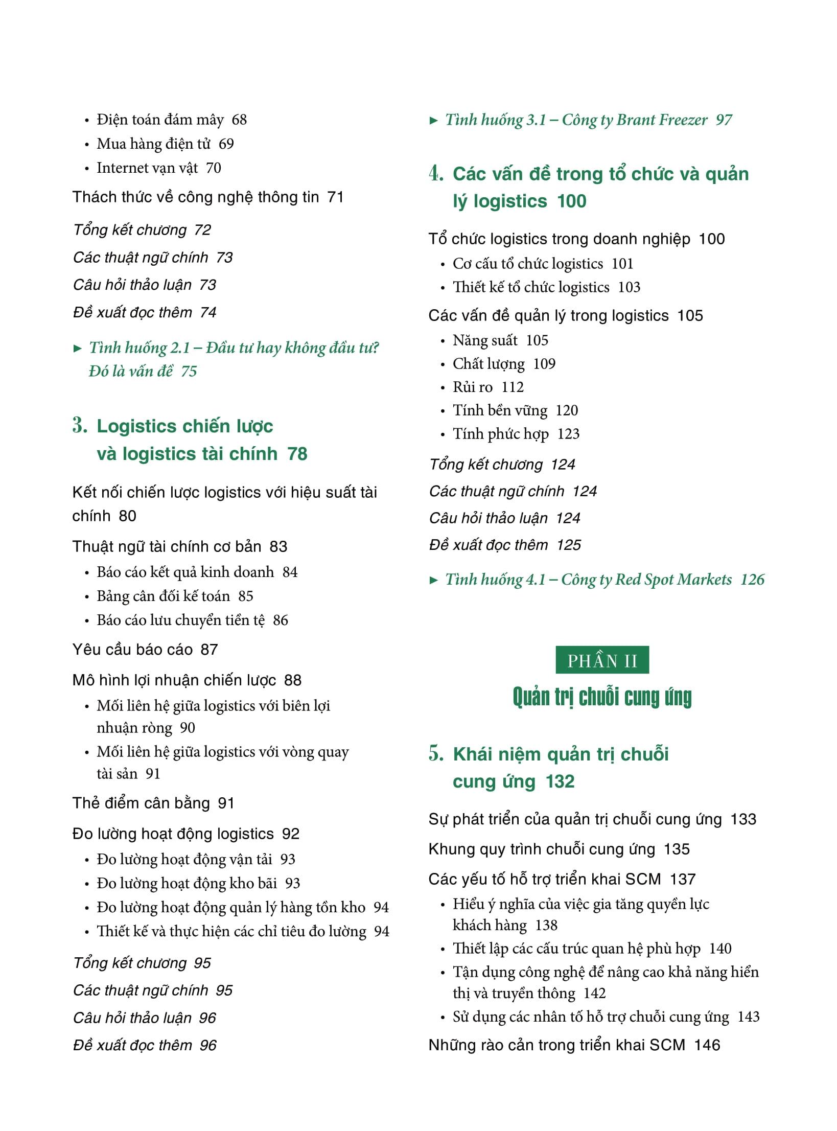 Logistics và Quản trị chuỗi cung ứng là một cuốn “bách khoa toàn thư” mang đến những kiến thức, hướng dẫn đầy đủ nhất về Logistics và quản trị chuỗi cung ứng đương đại. Điều đó sẽ mang đến cho độc giả những thông tin và kiến thức chính xác, bổ ích nhưng vẫn vô cùng dễ dàng tiếp thu, giúp độc giả dễ dàng hơn trong việc tìm hiểu và nghiên cứu về ngành nghề “mắt xích phát triển kinh tế” này. Quyển textbook này sẽ giúp bạn nắm rõ từ kho vận đến giao nhận một cách dễ dàng với 3 phần chính: Tổng quan về Logistics, Quản trị chuỗi cung ứng và Các thành tố của hệ thống Logistics. Mỗi phần sẽ tiếp tục chia ra thành các mục nhỏ, bảo đảm sẽ giúp bạn hiểu tường tận từng ngõ ngách của Logistics và quản trị chuỗi cung ứng.