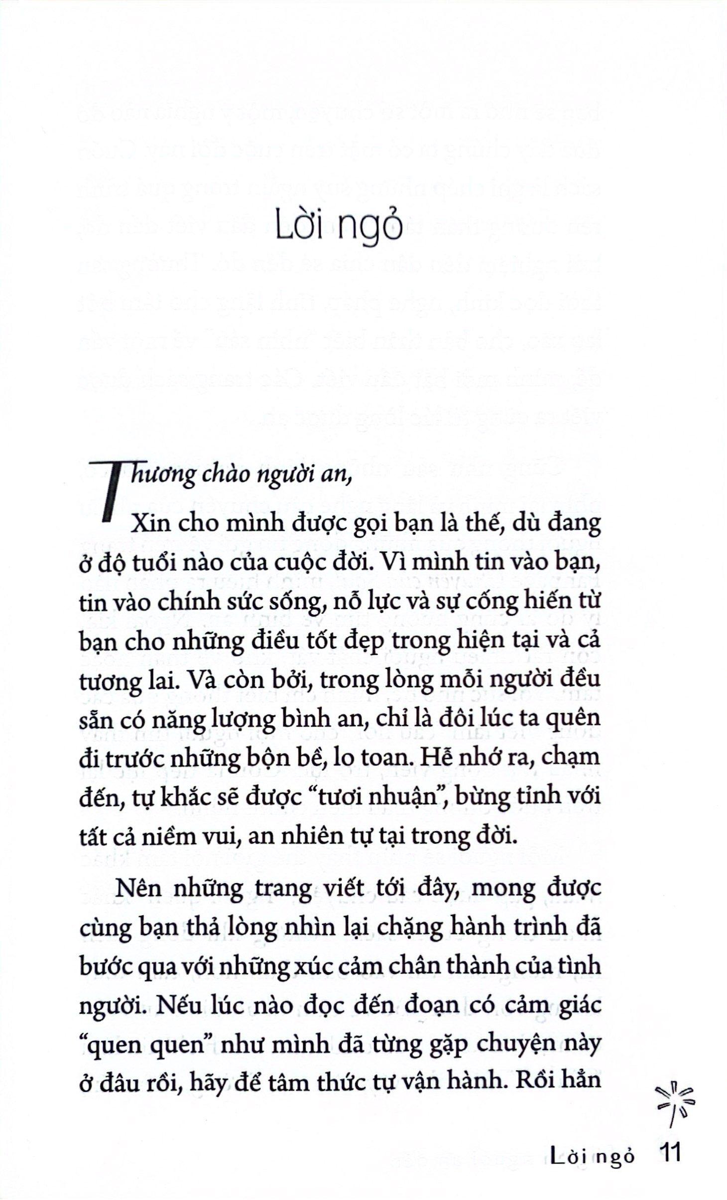 - Đúng hay sai, sau cùng đều là trưởng thành Trích dẫn sách: Trích đoạn 1: Làm người có chút “mẻ”, chút “sứt” mới hiểu được sự tròn khuyết của thế gian. Trầm m.ình tĩnh lặng trong gian khó, bĩ cực rồi mới có ngày thái lai. Khổ thì cũng khổ rồi, sợ khó khăn thì khó khăn cũng tới rồi. Nên những ai khi đó, trong suy nghĩ nhắc lòng phải tiến bước thì khúc ngoặt nào trong đời cũng sẽ “lội” qua được. Còn những ai bỏ cuộc chạy trốn, chắc chắn không thể vượt qua và nhìn thấy điều tốt đẹp phía sau khúc quanh đó. Qua cơn giông tố mới biết đâu là cây chắc rễ. Qua những lúc không bình lặng mới bật mạnh mẽ những tiềm năng vô tận. Trong mỗi người đều có “vật báu”, tùy bản lĩnh mà phát sáng lên dần. Trích đoạn 2: Mỗi người không chỉ có một mà có thể rất nhiều “trạm sạc” trong suốt cuộc đời, biểu hiện dưới nhiều phương pháp, phương tiện, cách thức khác nhau. Đôi khi cùng một “trạm” nhưng dòng cảm nhận, chuyển hóa năng lượng lại khác nhau tùy theo độ tuổi, chặng đường, sự thiếu đủ của mỗi người. Và điều hay nhất của những “trạm sạc” nằm ở việc, nó luôn lan tỏa năng lượng an lành một cách rất tự nhiên. Như những con người sống bình dị, yêu đời trong chính cách họ sống. Nó tự động truyền cảm hứng tốt đẹp đi muôn nơi mà không hề gượng ép hay khiên cưỡng. Biết đâu chính bạn lại đang là “trạm sạc” cho một người nào đó thông qua những điều bạn đang cống hiến tận tụy và dùng chính trái tim cảm nhận những nét đẹp của cuộc đời. Điều gì từ trái tim sẽ chạm đến trái tim! Chúng ta tương hỗ qua lại để động viên nhau như vậy cũng là đang nuôi dưỡng cho mầm thiện trong lòng. Khi tính thiện ngày càng lớn, ta sẽ có những quyết định sáng suốt, vì vậy, cuộc sống sẽ tốt hơn, phải không bạn? Trích đoạn 3: Nếu ta chết đi, trở về hư không, hóa hư vô, không có gì là của ta thì không đúng. Rõ ràng, trong cái không vẫn có cái của riêng ta như thế. Những giá trị vô hình: tỉnh thức, bình an, hạnh phúc tình ngườ giống như “sợi tơ vàng” để con người nương vào đó trở về lại nguồn cội. Dù ở tuổi đời nào, kiếp sống nào, hễ rời xa những điều trên, lập tức chúng ta lại cảm thấy lạc lõng, chới với. Nhưng có điều, dù chúng ta đến từ đâu, từ cảnh giới hay hành tinh nào ngoài Vũ trụ bao la, đã trải qua bao nhiêu kiếp sống đi chăng nữa, hễ đã có mặt ở Trái đất này, là đang cùng học và cùng trưởng thành, rất công bằng. Không vì có sứ mệnh, hay tiền kiếp lừng lẫy thế nào, từ thời không nào đến mà một người được ưu á Ai cũng phải trải qua bài học về “đoạn khổ, hướng sáng”. Trích đoạn 4: Tâm trạng và tính cách cũng được “dịch” sang ngôn ngữ cơ thể – cách đi đứng, ứng xử và giữ gìn bản thân nói lên rất nhiều về chúng ta là ai và chúng ta như thế nào. Tất cả đều thể hiện sinh động qua hình tướng bên ngoài. Khi một người giữ ý nghĩ sống không thẹn với lòng, với người, sống chính trực, dường như từ trên đầu, trong tim và lan ra khắp cơ thể sẽ có một nguồn sáng vô hình rất đẹp. Ngọn đèn từ nhân cách sống sẽ soi rọi cho gương mặt trở nên sáng sủa. Thần thái, khí chất rạng ngời. Người khác nhìn vào sẽ có cảm giác tin tưởng và tôn trọng. Mục lục Phần 1: Cho đời thêm nhẹ Mỉm cười ngay với phiên bản tệ nhất của bản thân Chúng ta của thời điểm này Điều kỳ diệu nơi sự xáo trộn Ai cũng có những câu chuyện riêng Tôi cần bạn Vâng, m.ình vẫn có đây! Ai cũng cần tình thương để lớn Cuộc đời luôn có những cách động viên âm thầm Đợi con tim biết vui trở lại Đi trong những ngày mưa Để nụ cười đừng tắt trong lòng “Điểm sáng” từ nghịch cảnh Thấy tổn thương nhưng đừng ở với tổn thương Hái sao trong lòng Để khi đi trốn có người đi tìm An dịu thân tâm với việc rèn dưỡng Ngừng để ổn, ngừng để đi tiếp Lâu lâu thả nguyện ước lên cao Chuyển hóa nỗi lo bằng việc rèn dưỡng Làm bạn với chính m.ình À, ngồi nghỉ cho khỏe! Hiểu người, người đến gần Cứ để điều tốt đẹp có mặt Hiểu rõ nhưng không cần làm rõ Thương, nhưng cứ để đó! Để năng lượng đẹp từ những điều chưa đẹp Mang năng lượng tích cực vào mọi quyết định Cho m.ình một quãng nghỉ Bước về nơi phù hợp Làm việc trong hạnh phúc Tươi cũng cầ tưới Tích cực cũng có cách riêng Có những ngày thấy vui đến lạ! Đâu cũng vào đấy! An là để cho người chưa an Mỗi người đều có riêng “trạm sạc” ấm lòng Phần 2: Cho duyên thêm lành Khi có rung cảm Người cần đến nhất định sẽ đến Thương trước, thương sau Có mặt trong từng bài học cuộc đời Nghe thấy hạnh phúc rồi sẽ hạnh phúc Nhẹ nhàng làm người tốt Lương tâm con người đều có những điều dễ thương “Bộ lọc” an lành Để những người cùng “tần số” là bạn lành Đến một n