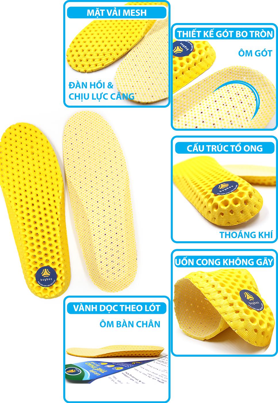 Lót giày có cấu trúc tổ ong thông hơi thoáng khí giúp bàn chân khô thoáng, giảm mùi hôi cho chân.