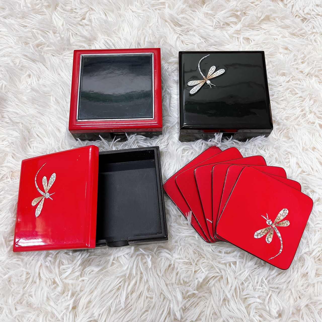 Hộp lót ly có phong nền đỏ,bên trên được khảm trứng hình con chuồn chuồn,làm cho hộp lót ly thêm phần đẹp mắt