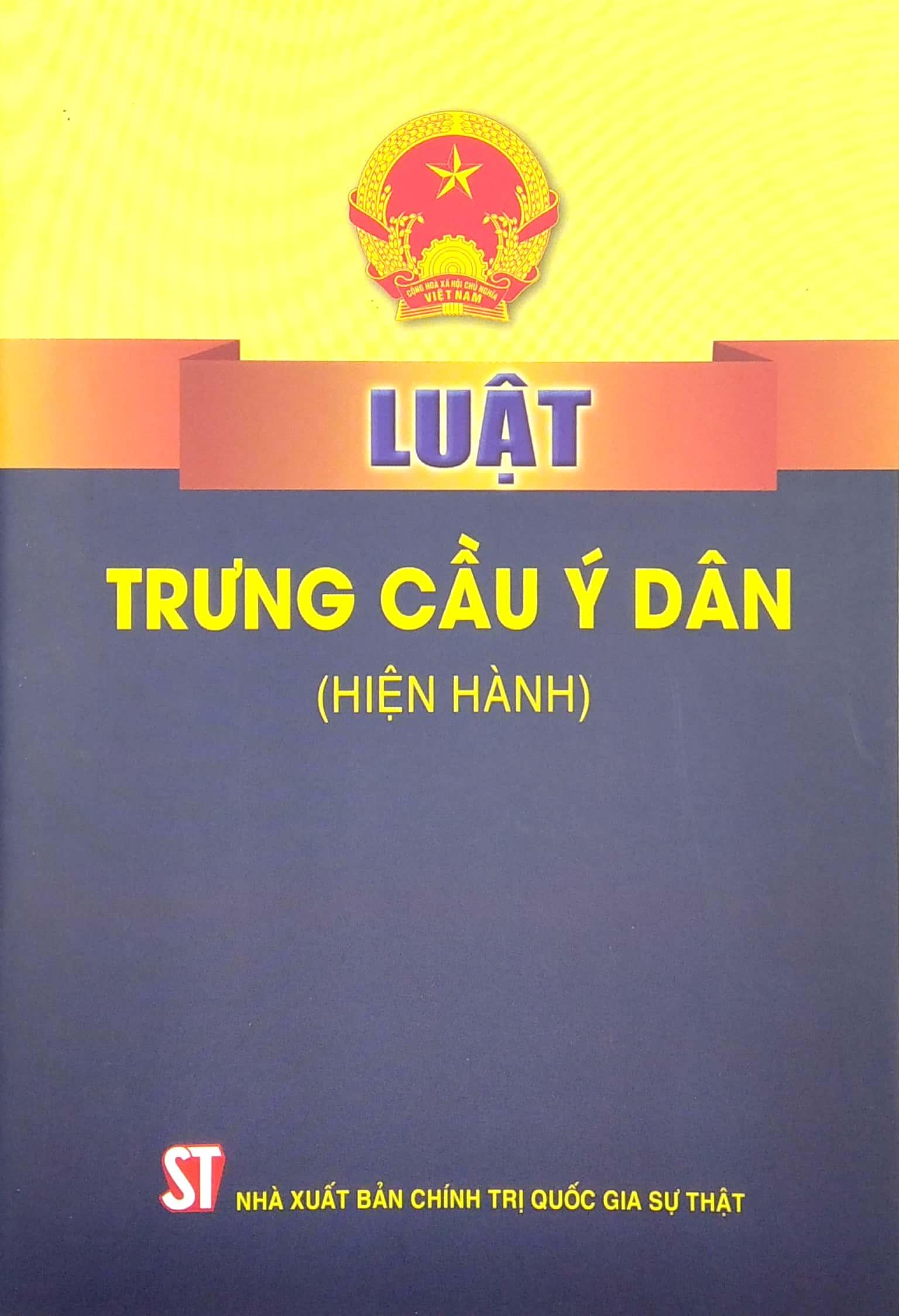 Mua tại TiktokLuật Trưng cầu ý dân (hiện hành) được Quốc hội khóa XIII, kỳ họp thứ 10 thông qua ngày 25/11/2015, có hiệu lực thi hành từ ngày 01/7/2016. Luật gồm 8 chương, 52 điều, quy định về việc trưng cầu ý dân; nguyên tắc trưng cầu ý dân; nhiệm vụ, quyền hạn của cơ quan, tổ chức trong tổ chức trưng cầu ý dân; trình tự, thủ tục quyết định việc trưng cầu ý dân và tổ chức trưng cầu ý dân; kết quả và hiệu lực của kết quả trưng cầu ý dân…
