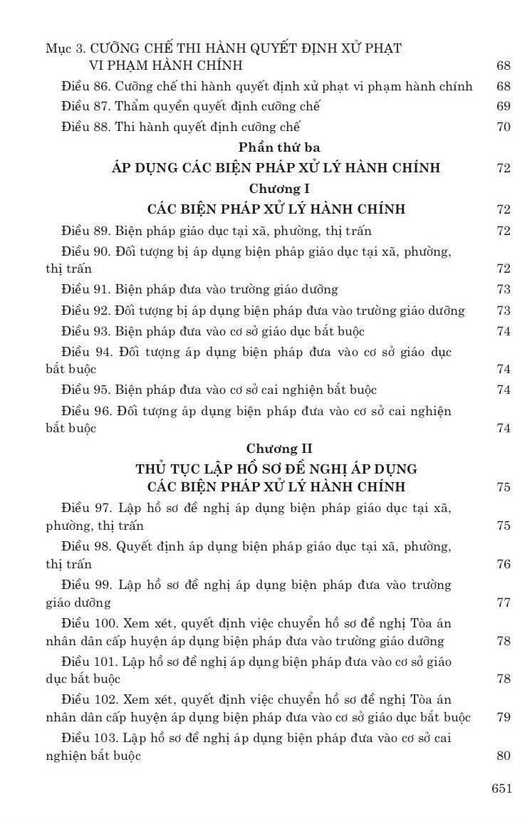 Luật gồm: – Những quy định chung – Xử phạt vi phạm hành chính – Áp dụng các biện pháp xử lý hành chính – Các biện pháp ngăn chặn và bảo đảm xử lý