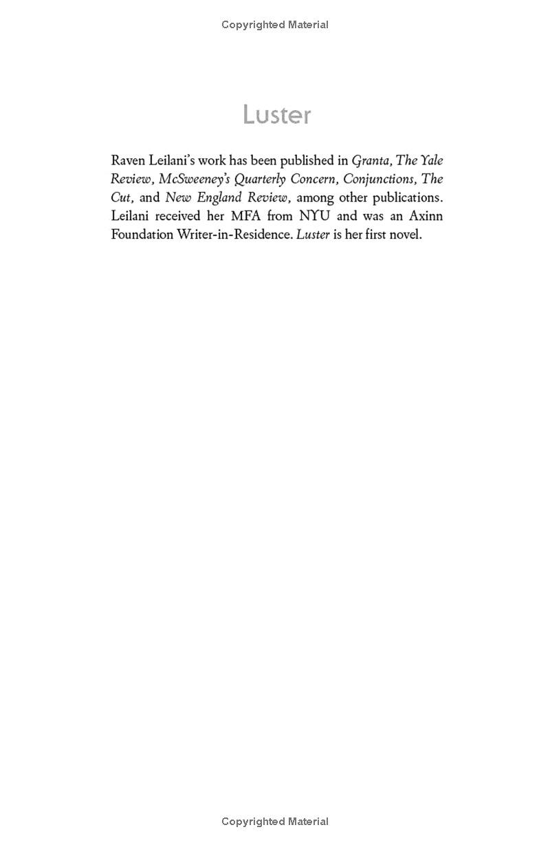 Irresistibly unruly and strikingly beautiful, razor-sharp and slyly comic, sexually charged and utterly absorbing, Raven Leilani’s Luster is a portrait of a young woman trying to make sense of her life―her hunger, her anger―in a tumultuous era. It is also a haunting, aching description of how hard it is to believe in your own talent, and the unexpected influences that bring us into ourselves along the way.