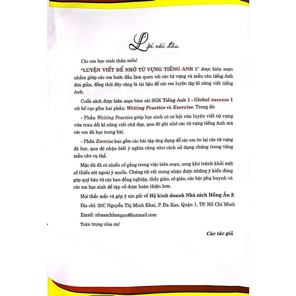 Mua tại TiktokSách - Luyện Viết Để Nhớ Từ Vựng Tiếng Anh Lớp 1 (Bám Sát SGK Global Success 1) (HA) Lời nói đầu Các em học sinh thân mến! “LUYỆN VIẾT ĐỂ NHỚ TỪ VỰNG TIẾNG ANH 1” được biên soạn nhằm giúp các em bước đầu làm quen với các từ vựng và mẫu câu tiếng Anh đơn giản, đồng thời đây cũng là tài liệu để các em luyện tập kĩ năng viết tiếng Anh. Cuốn sách được biên soạn bám sát SGK Tiếng Anh 1 - Global success 1 với bố cục gồm hai phần: Writing Practice và Exercise. Trong đó: