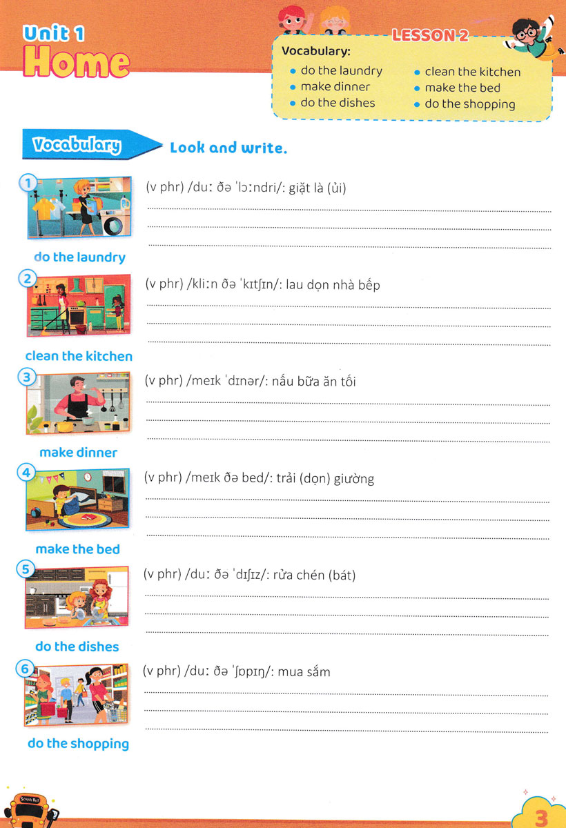 Từ đó, các em có thể sử dụng từ để xây dựng câu trong hoạt động giao tiếp, cũng như giải quyết các bài tập về từ vựng, ngữ pháp… Các em sẽ luyện viết và học từ tiếng Anh bằng các hình ảnh minh họa sinh động. Sau phần luyện từ vựng là các hoạt động chọn từ đúng, điền từ, ghép từ với hình thích hợp, sắp xếp từ, Sau mỗi đơn vị bài học có phần ôn tập (Review) với các hoạt động lý thú giúp các em củng cố kiến thức. Thông qua các hoạt động này các em sẽ cảm thấy hứng thú và tích cực hơn trong quá trình học tập môn Tiếng Anh.