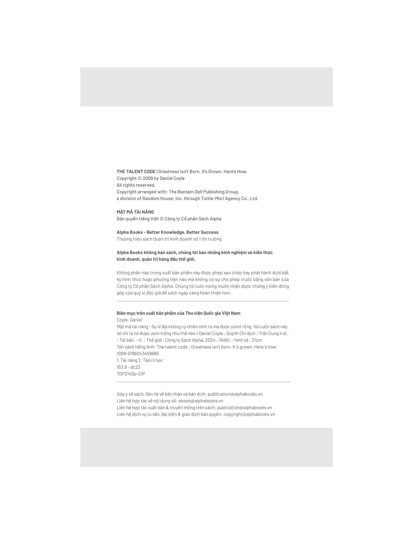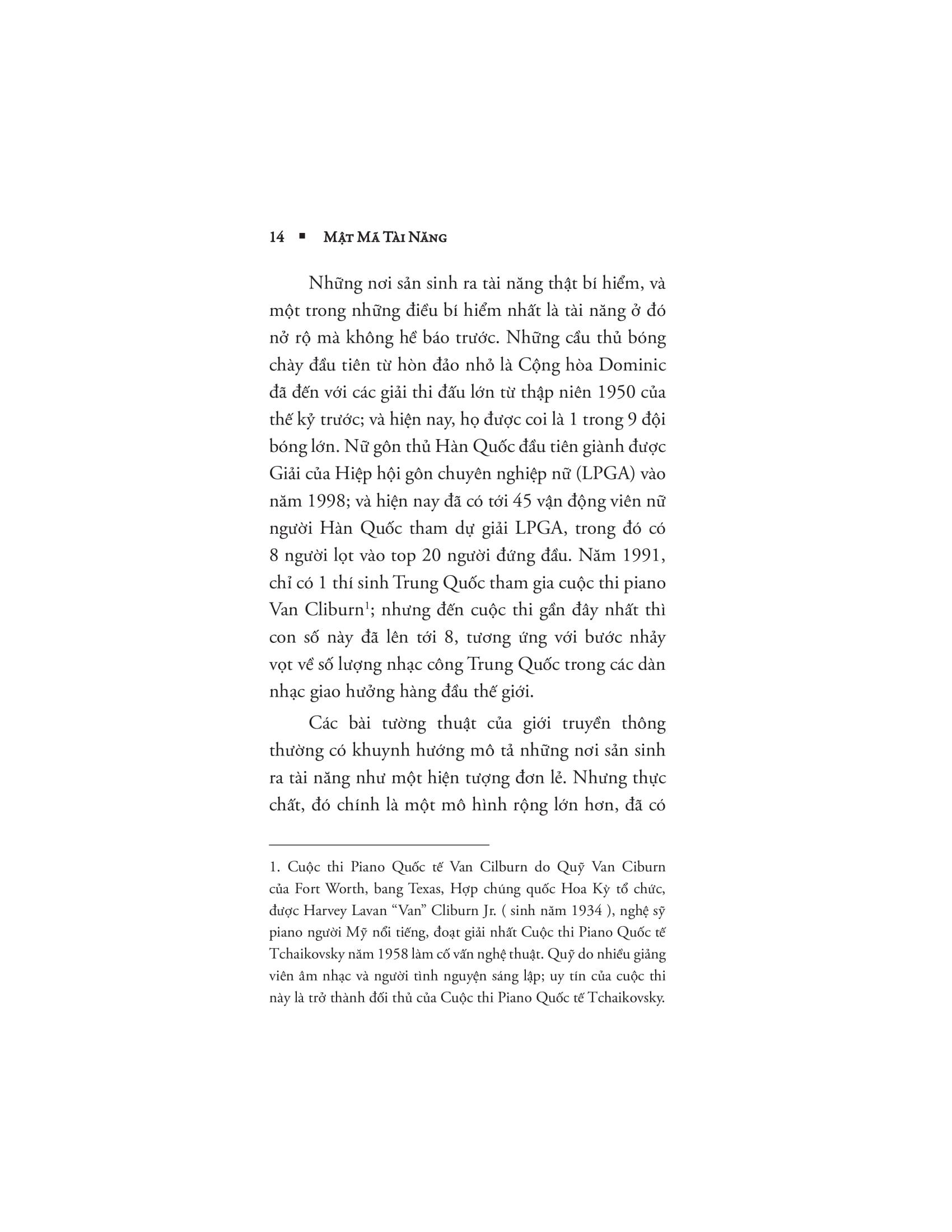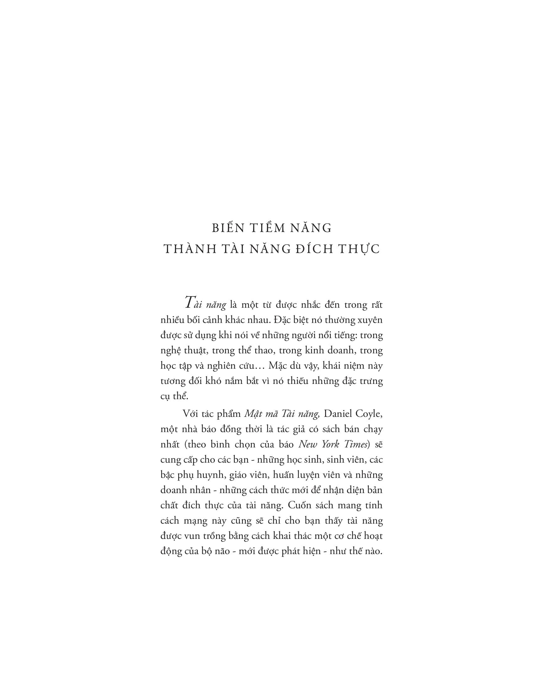 Dù bạn đang huấn luyện cho một đội bòng bầu dục hay dạy một đứa trẻ chơi đàn piano, viết tiểu thuyết hay cố gắng cải thiện cú vung gậy trong môn bóng chày thì cuốn sách mang tính cách mạng này sẽ chỉ cho bạn biết cách nuôi dưỡng và phát triển tài năng thông qua việc khai thác và sử dụng một cơ chế mới được khám phá của não bộ.