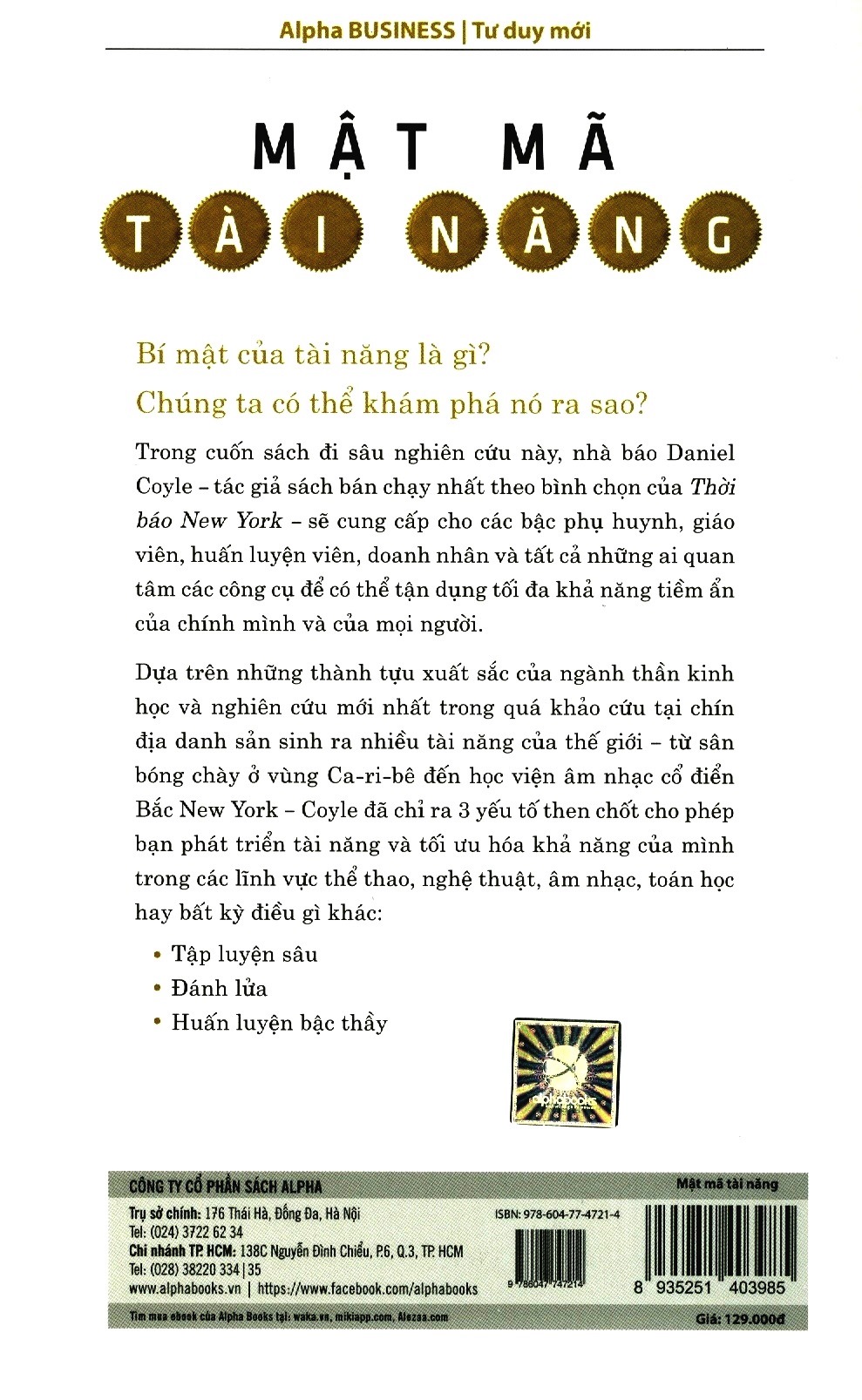 Bí mật của tài năng là gì? Chúng ta có thể khám phá nó ra sao? Trong cuốn sách đi sâu nghiên cứu này, nhà báo - tác giả có sách bán chạy nhất theo bình chọn của Thời báo New York - Daniel Coyle sẽ cung cấp cho các bậc phụ huynh, giáo viên, huấn luyện viên, doanh nhân – và mọi người khác nữa – các công cụ để có thể tận dụng tối đa các tiềm năng của chính bản thân và mọi người.