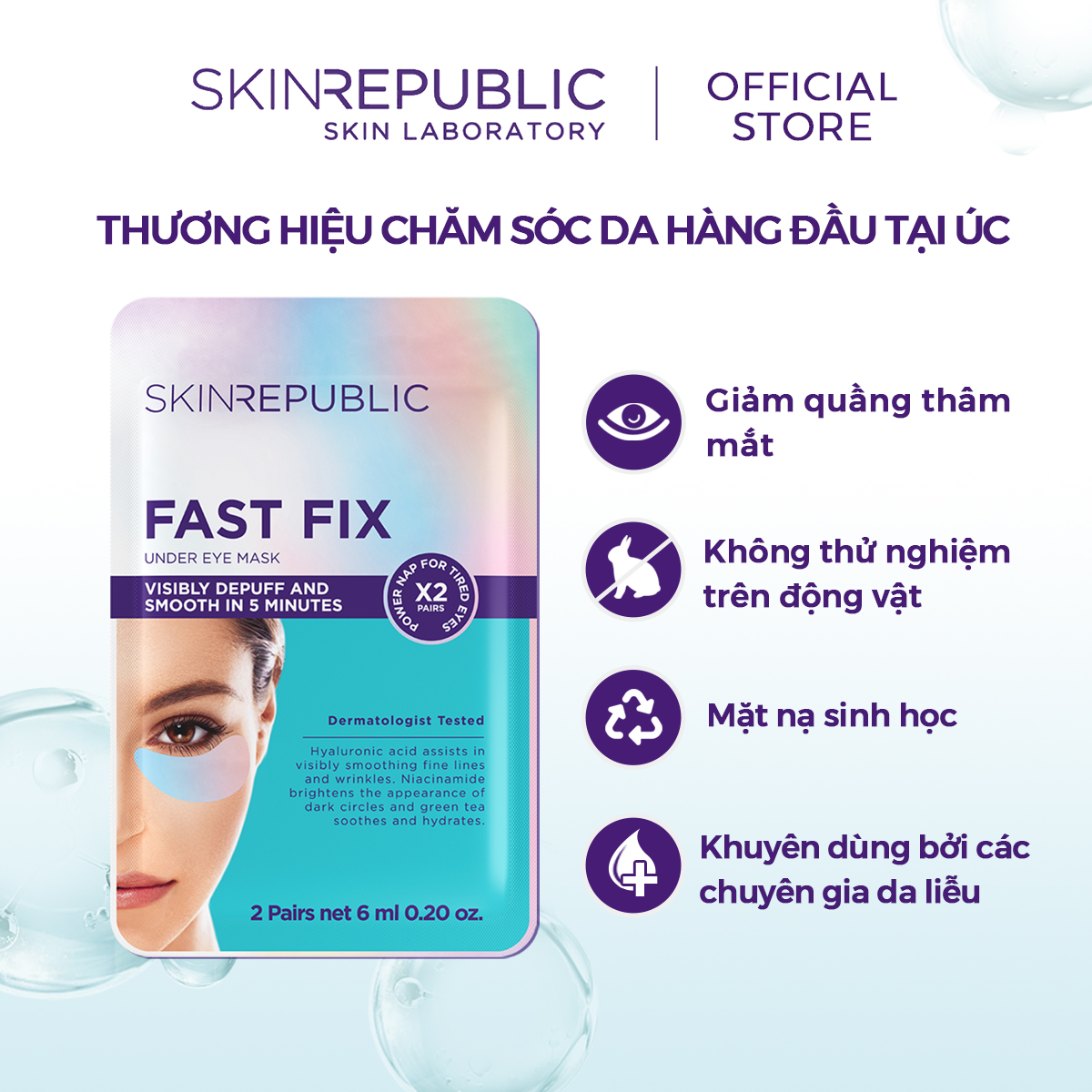 Mua tại TiktokMặt nạ mắt Skin Republic Fast Fix Holographic Foil Under Eye Patch (2 cặp) 6ml Mặt nạ mắt Skin Republic Fast Fix Holographic Foil Under Eye Patch nạp năng lượng cho đôi mắt mệt mỏi, giúp loại bỏ quầng thâm, giảm bọng mắt và làm mịn màng trong nháy mắt. Công nghệ mặt nạ thiếc sử dụng nhiệt tự thân, giúp các hoạt chất thẩm thấu sâu hơn vào da. Đồng thời lớp thiếc trên mặt nạ sẽ tạo thành hàng rào giúp dưỡng chất trong mặt nạ không bị bay hơi, được bảo toàn gần như 100% trong thời gian đắp và có tác dụng lên da tức thì, kết hợp với các thành phần chính từ Trà xanh và Axit Hyaluronic, từ đó giúp vùng da dưới mắt được nuôi dưỡng sâu hơn, vùng da quanh mắt được nhanh chóng phục hồi, làm mịn và dưỡng ẩm. Ngoài ra, cũng giúp lớp trang điểm mịn màng và lâu trôi hơn. HƯỚNG DẪN SỬ DỤNG