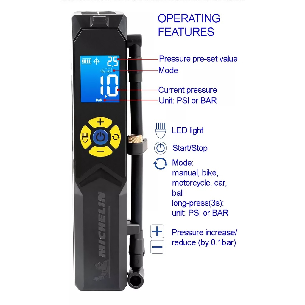 THÔNG TIN KỸ THUẬT - Tên sản phẩm: Máy bơm lốp xe đạp, xe máy, mô tô siêu tốc MICHELIN 12320 dùng pin - Model: 12320 - Công dụng: bơm hơi các loại xe đạp, xe