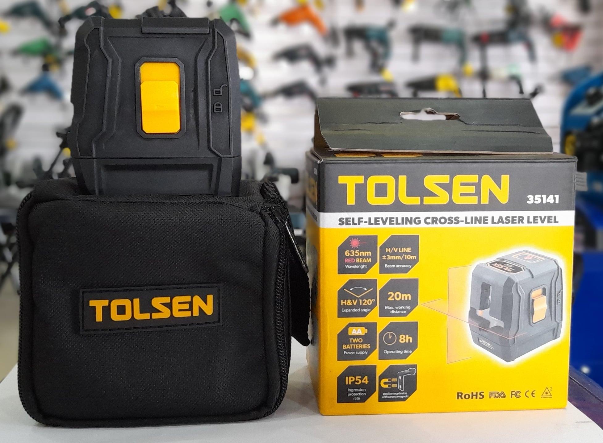 Thông số kĩ thuật -Mã sản phẩm: 35141 -Thương hiệu: TOLSEN -Xuất xứ: Trung Quốc -Wavelenght: 635nm Đèn đỏ • Độ chính xác chùm tia: -Đường H/V ± 3 mm/10m -Góc mở rộng: H & V 120 ° -Tối đa khoảng cách làm việc: 20m -Cung cấp năng lượng: pin 2xAA -Thời gian hoạt động: 4h • Tỷ lệ bảo vệ chống xâm nhập: IP54 -Nhiệt độ lưu trữ: -20 ° C - + 70 ° C -Tính năng, đặc điểm:V Cung cấp khả năng hiển thị dòng tối đa trong điều kiện làm việc tiêu chuẩn -Các chế độ thiết lập Laser dễ sử dụng - Dự án các đường dọc, ngang và chéo. Các đường có thể được chiếu riêng rẽ hoặc cùng nhau cho nhiều ứng dụng cấp độ và căn chỉnh -Tự cấp và chỉ ra tình trạng ngoài cấp; khóa khi tắt để vận chuyển laser an toàn -Chế độ thủ công - Khóa đường để sử dụng ở mọi góc độ • -Bao gồm một thiết bị định vị với nam châm mạnh -Đóng gói: hộp màu "
