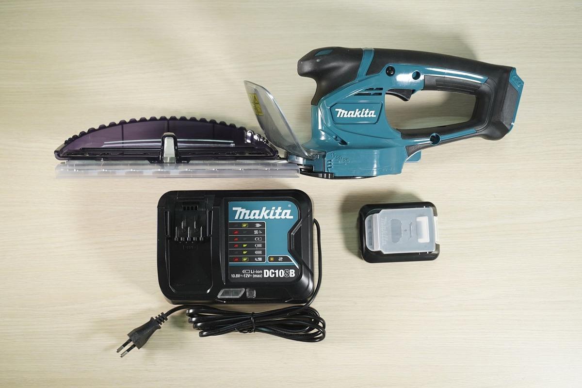 Trong hộp có: Máy cắt Makita UH201DSY, Khay chứa cỏ(198402-3), Vỏ lưỡi(458342-0), Lưỡi cắt. 1 pin 12V max 1.5Ah và 1 sạc nhanh.