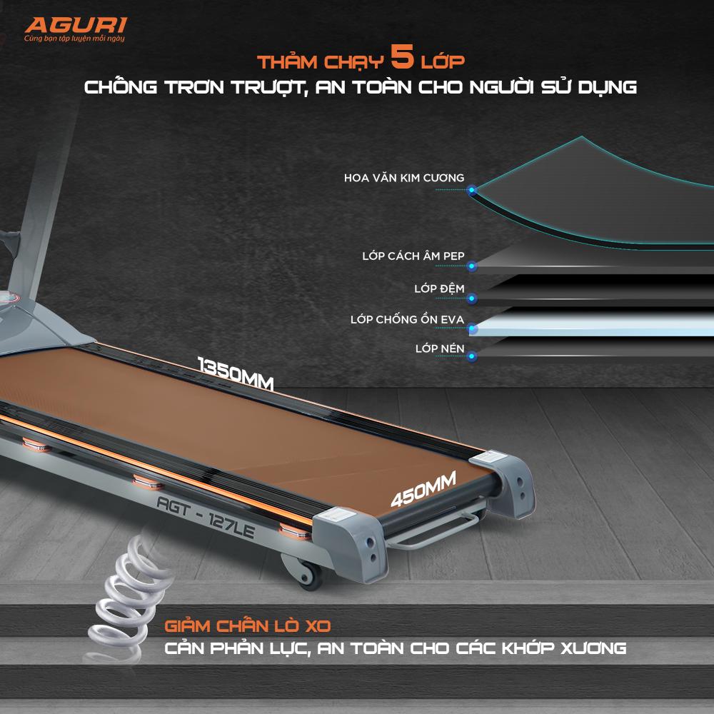 Máy chạy bộ AGURI AGT-127LE - máy chạy bộ tại nhà Đây là máy chạy bộ chính hãng của thương hiệu AGURI - Máy tập của Cầu thủ Công Phượng. Là mẫu máy chạy bộ giá tốt được nhiều người tiêu dùng lựa chọn. Một mẫu máy chạy bộ gấp gọn dễ dàng, tiết kiệm không gian cho người dùng. > THÔNG SỐ KỸ THUẬT: - Motor DC công suất 3.5HP - Tốc độ: 1.0km/h – 16km/h - Chương trình mặc định: P1-P24 - Kích thước đặt máy (dài-rộng-cao): 1760*720*1320mm - Kích thước đóng thùng: 1780*760*325mm - Diện tích băng tải: 450*1350mm - Trọng lượng người dùng tối đa: 130 kgs - N.W/G.W: 80/90kg > MÔ TẢ SẢN PHẨM: - Màn hình LED 5 cửa số hiển thị: thời gian, quãng đường, vận tốc, nhịp tim, calories, chương trình mặc định - Máy có piston thủy lực nâng đỡ, có thể gập gọn máy khi không sử dụng, bàn chạy có tay cầm để dễ dàng nhấc bàn chạy lên - Máy có bánh xe di chuyển rất dễ dàng - Máy được trang bị 1 đầu massage, đánh mỡ bụng ; bộ phận gập bụng - Có hệ thống giảm sóc khi hoạt động, kết nối Bluetooth, hệ thống 2 loa stereo - Có chức năng đo chỉ số cơ thể (Body fat) > CHÍNH SÁCH BẢO HÀNH, BẢO TRÌ: - Bảo hành chi tiết máy lên tới 5 năm. Cụ thể: