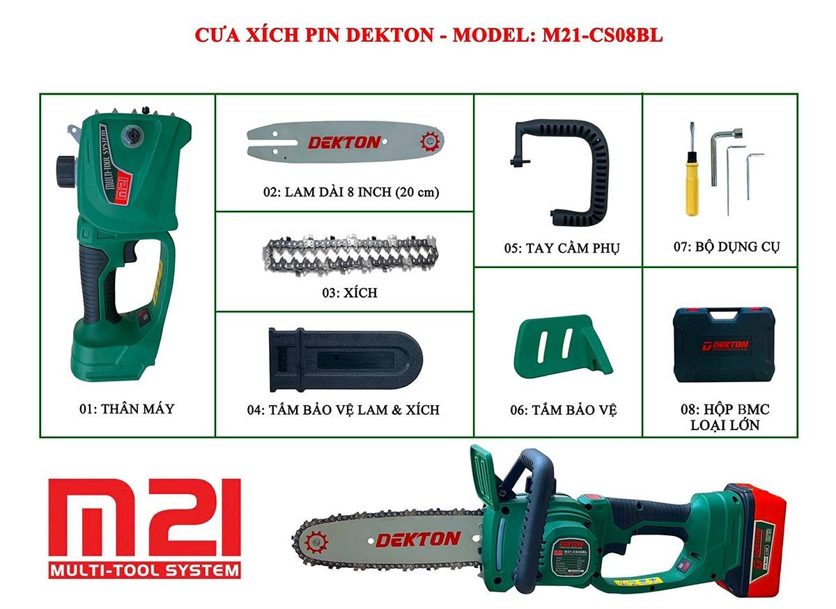 THÔNG SỐ KỸ THUẬT DEKTON M21-CS08BL -Model: M21-CS08BL -Hãng: Dekton -Sản xuất: Trung Quốc -Bảo hành: 6 tháng -Nguồn: 21V [Chân Pin Makita] -Motor: Brushless -Chiều dài xích: 8 inch -Tốc độ: 8m/s -Bình chứa dầu: 70ml -Phụ kiện: