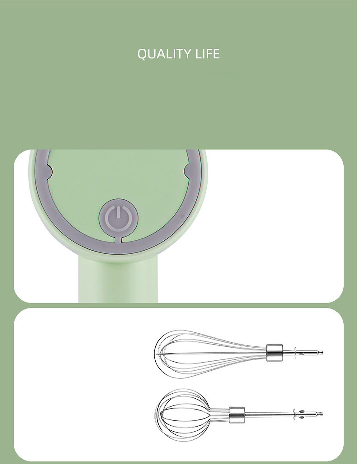 Đây là chiếc máy đánh trứng tuyệt vời cho các mẹ. Là dạng máy cầm tay, nên các mẹ có thể đánh trứng ở bất kỳ đâu: trong chén to, trong ly/cốc, trong nồ đều được. Máy đi kèm với 2 thanh đánh trứng nhiều cạnh, và 2 que xoắn để nhào bột hoặc trộn salad. Que trộn làm từ inox, có thể tháo rời được, dùng xong chỉ cần tháo ra vệ sinh que trộn là xong.