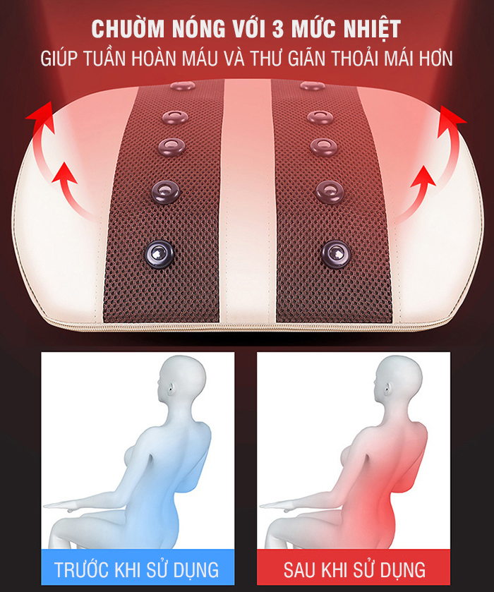 Ngoài khả năng nâng đỡ túi khí và công nghệ massage rung, đệm còn tạo nhiệt chườm nóng giúp đánh tan những cơn đau nhức thường trực và gia tăng tuần hoàn máu ở những khu vực massage. Từ đó giúp bạn cảm thấy thư giãn thoải mái hơn. Có 3 mức nhiệt cho người dùng điều chỉnh là E1-E2-E3.