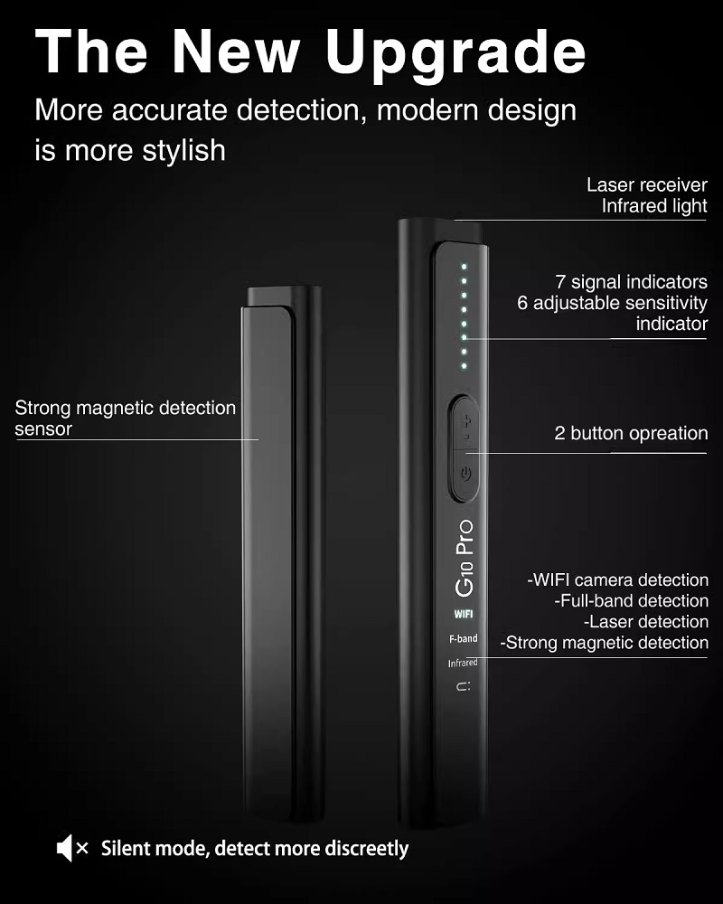 Chức năng: Sản phẩm này áp dụng phương pháp thụ động không dây tần số quét, có thể chính xác tìm ra: nghe lén thiết bị điện thoại nghe trộm, kỹ thuật số nghe trộm, thiết bị theo dõi, xe nghe trộm, camera không dây, có dây camera. Nó có thể có hiệu quả ngăn chặn nghe trộm, chụp ảnh. Và bảo vệ riêng tư cá nhân và thông tin bí mật. Tính năng: Chống Gián Điệp, Chống nghe trộm, Chống Theo Dõi Nhỏ Kích Thước Di Động Với tự động chức năng phát hiện, di động chủ để dễ dàng mang theo. với 6 cường độ tín hiệu có thể điều chỉnh độ nhạy của thiết bị, nhanh chóng tìm ra nguồn gốc của tín hiệu. Độ nhạy có thể được điều chỉnh bằng cách điều chỉnh chiết áp. (tăng độ nhạy để mở rộng phạm vi phát hiện hoặc giảm độ nhạy để rút ngắn phạm vi phát hiện để tìm nhanh hơn) Thông số: Giao Diện sạc: Type-C Ăng ten: đa hướng Ăng ten Đạt Được: -14db Nguồn điện Cung Cấp: DC5V/500mA Pin: 3.7V/200mA Pin ithium Độ nhạy: 6 cấp độ có thể điều chỉnh Dải tần số: 50MHz-6GHz Tín hiệu phạm vi Phát Hiện: 5 cm ~ 10 mét Ống kính quang học: Đặc Biệt bộ lọc Laser phạm vi phát hiện: 10 cm ~ 15 Mét Thời gian sử dụng: 15 giờ Thời gian sạc: 1 giờ Trọng lượng: 38g Máy Dò Phát Hiện Theo Dõi Camera, GPS, Nghe Lén, Định Vị Detector WT16 Bộ sản phẩm Bao Gồm: 1 x Máy Dò 1 x Cáp USB 1 x Hướng Dẫn Sử Dụng (Tiếng Anh) Hướng dẫn: