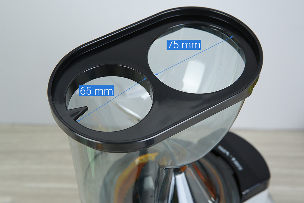 Đường kính ống tiếp nguyên liệu: 75mm - Có thể xay ép hoa quả nguyên trái hoặc miếng lớn, giúp tiết kiệm thời gian sơ chế.