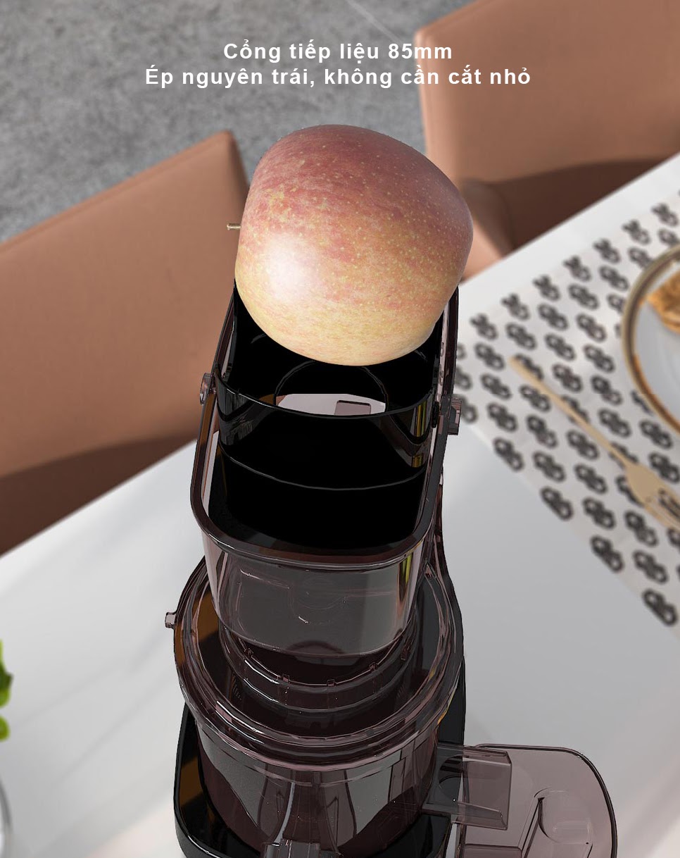 Ép kiệt hơn, giàu Vitamin và nhiều hương vị hơn! Đường kính khoang ép lớn lên đến 130mm, giúp ép nguyên quả dễ dàng mà không cần cắt nhỏ. Tốc độ quay chậm chỉ 40