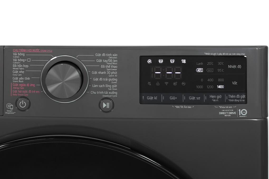 - Công nghệ giặt hơi nước Steam, giúp quần áo có thể loại bỏ được 99.9% các chất gây dị ứng hay các vấn đề về đường hô hấp. Ngoài ra, công nghệ giặt này cũng giúp cho quần áo ít bị nhăn hơn sau mỗi lần giặt. *Hình ảnh chỉ mang tính chất minh hoạ Tiện ích - Tự động chẩn đoán lỗi: giúp người dùng có thể biết được máy giặt đang mắc phải những lỗi gì, tiện lợi hơn khi báo tình trạng máy để sửa chữa mà không mất nhiều thời gian kiểm tra rồi mới đến khâu sửa chữa, thay thế.