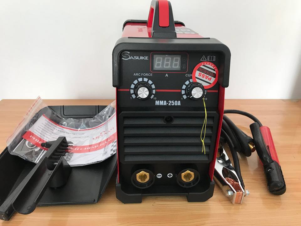 Máy hàn điện tử Sasuke MMA 250A đi kèm kìm hàn, kẹp mass, búa gõ xỉ, mặt nạ hàn, kính hàn. Với dòng hàn lên tới 250A và sử dụng loại que hàn 1.6mm - 4.0mm chiếc máy hàn MMA 250A sẽ đáp ứng được nhu cầu hàn vật liệu cho công trình lớn, xưởng cơ khí, nhà thép tiền chế.
