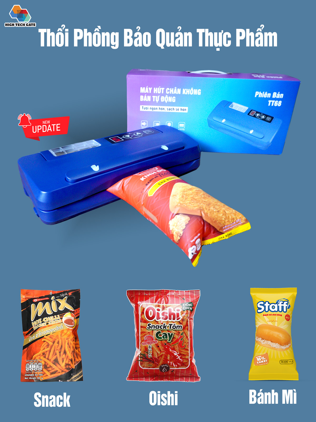 Phiên bản TT68 được trang bị thêm chức năng thổi phồng túi, giúp người dùng có thể bảo quản các đồ thực phẩm dễ nát, giòn như khoai tây chiên, bắp rang bơ, oishi, bánh mì, một cách tiện lợi ngay tại nhà.