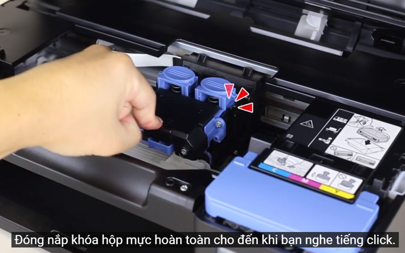 Sau khi lắp xong hộp mực, đóng nắp nghe tiếng "click" là nắp đã vào đúng khớp khóa.