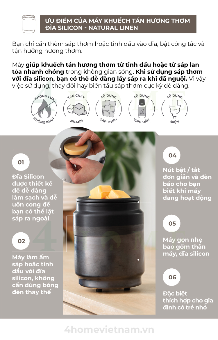 - Vừa làm đốt nến lãng mạn, vừa xông tinh dầu thơm ngát - Khuếch tán mùi thơm, tinh dầu thơm dễ chịu, khử mùi hôi triệt để, đặc biệt hiệu quả với không gian