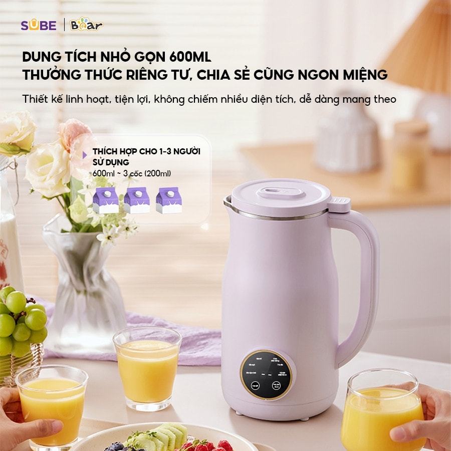 - Dung tích 600ml, phù hợp cho gia đình 1 – 3 người Máy làm sữa hạt Bear SB-SH06D 5 chức năng nấu – Tối ưu dinh dưỡng Không chỉ sở hữu thiết kế linh hoạt, dễ mang theo khi cần thiết, máy làm sữa hạt Bear SB-SH06D còn mang đến cho người dùng tính năng đa ứng dụng, với khả năng làm sữa ngô, sữa đậu nành, xay sinh tố, làm trà sữa và nấu cháo dinh dưỡng. Nhiều món ngon được tích hợp trong một thiết kế nhỏ gọn, người dùng chỉ cần bỏ nguyên liệu vào máy theo hướng dẫn và nhấn nút chọn chế độ tương ứng là xong. Máy có tính năng hẹn giờ (tối đa 12 tiếng) cho những ai muốn tận dụng thời gian, nấu khi không có ở nhà hoặc nấu qua đêm để sáng mai có ngay ly sữa nóng hổi thưởng thức. Máy làm sữa hạt Bear SB-SH06D sở hữu đa dạng tính năng hiện đại Máy làm sữa hạt Bear SB-SH06D có cơ chế hẹn giờ thông minh Công suất mạnh mẽ, vận hành êm Máy làm sữa hạt Bear SB-SH06D gây ấn tượng với công suất tối đa 500W, đủ mạnh mẽ để làm nhuyễn mọi nguyên liệu trong tích tắc. Sản phẩm có 5 lớp giảm tiếng ồn gồm: Vòng đệm trên nắp đậy, vỏ bọc khóa tiếng vận động của động cơ bên trong, động cơ đồng trục giảm tiếng ma sát của bánh răng, lớp chắn giảm tiếng ồn cộng hưởng và ống gió giảm tiếng ồn tập trung. 5 lớp giảm ồn trên đảm bảo máy vận hành êm ái, không rung lắc làm sai lệch vị trí, tiếng ồn nhỏ, không đủ làm ảnh hưởng đến giấc ngủ khi bạn hẹn giờ nấu tự động vào ban đêm. Máy làm sữa hạt Bear SB-SH06D tích hợp nhiều lớp giảm tiếng ồn hiệu quả Máy làm sữa hạt Bear SB-SH06D có dung tích nhỏ gọn, đủ cho gia đình nhỏ Chất liệu an toàn, bền bỉ Chất liệu mà Bear sử dụng cho máy làm sữa hạt SB-SH06D tương đối đa dạng, nổi bật là lưỡi dao và lõi nồi bằng inox 304 chống han gỉ, vỏ nhựa PP cao cấp cách nhiệt, gioăng silicon, trục đồng cho động cơ… tất cả đều có độ bền tốt, tuổi thọ cao, sử dụng lâu dài, thường xuyên mà không lo giảm chất lượng sản phẩm theo thời gian. Máy làm sữa hạt Bear SB-SH06D sở dụng chất liệu an toàn, bền bỉ với thời gian Dễ sử dụng, tiện vệ sinh Máy làm sữa hạt Bear SB-SH06D có màn hình cảm ứng thông minh, người dùng chỉ cần nhấn nút để lựa chọn. Khi bạn muốn vệ sinh máy, chỉ cần chọn chế độ “Vệ sinh nhiệt độ cao” là máy sẽ tự động làm sạch bên trong, vô cùng thuận tiện, hiện đại. Máy làm sữa hạt Bear SB-SH06D có chế độ vệ sinh nhiệt độ cao hiện đại