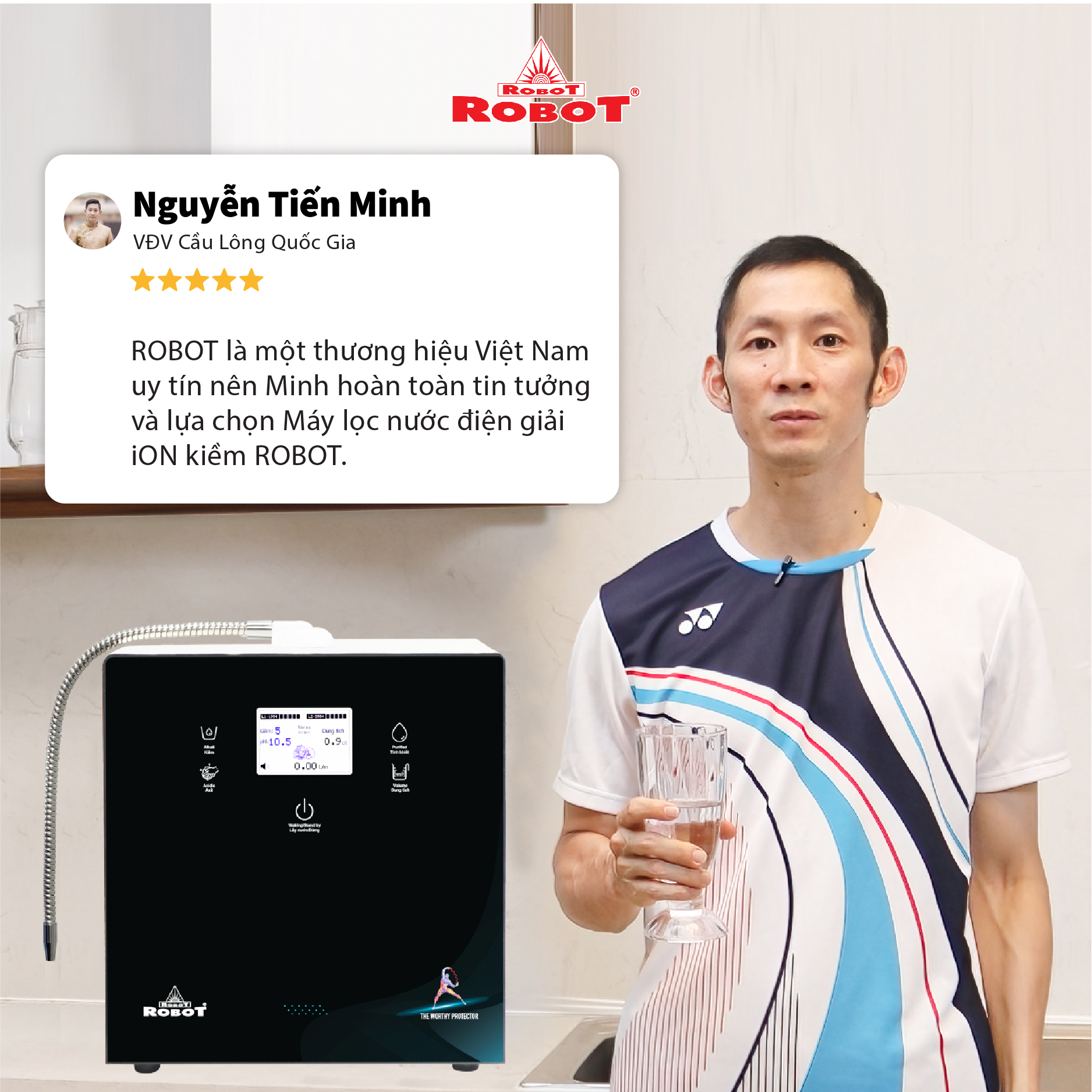 +++ VĐV Cầu Lông Nguyễn Tiến Minh – tay vợt từng đứng Top 5 Thế Giới chia sẻ: Sau một thời gian sử dụng Máy lọc nước điện giải iON kiềm Minh thấy cải thiện sức khỏe rất nhiều và tốc độ hồi phục sau tập luyện, thi đấu cũng nhanh hơn so với trước đây. Bây giờ mỗi khi đi tập, hay khi đi thi đấu, Minh đều mang theo nước iON kiềm để uống. ROBOT là một thương hiệu Việt Nam uy tín nên Minh hoàn toàn tin tưởng và lựa chọn Máy lọc nước điện giải iON kiềm ROBOT.