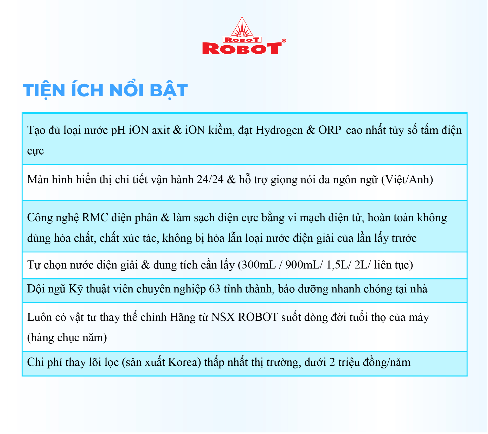 ️ Máy lọc nước điện giải iON kiềm ROBOT ionPrince 79 là sản phẩm được sản xuất với công nghệ tiên tiến, cao cấp trang bị đến 7 tấm điện cực lớn nhất, có khả năng tạo ra đến 9 loại nước đa chức năng, với 5 mức nước iON kiềm (pH 8.5 – 10.5), nước lọc trung tính (pH 7.0) & 3 mức nước iON axit (pH 4.5 - 5.5). Chất lượng nước đạt chỉ số tối ưu, nồng độ Hydro hoạt tính lên đến ~800 -> 950 ppb, chống oxy hóa (ORP) lên đến ~ -400 -> -600 mV, đáp ứng mọi nhu cầu sử dụng trong cuộc sống.