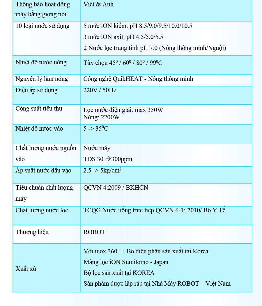 - Và 3 mức nước iON axit (pH 4.5/5.0/5.5). Chất lượng nước đạt chỉ số tối ưu, nồng độ Hydro hoạt tính lên đến ~ 750 -> 850 ppb, chống oxy hóa (ORP) lên đến ~ -350 -> -500 mV, đáp ứng mọi nhu cầu sử dụng trong cuộc sống. Máy lọc nước điện giải iON kiềm Nóng ROBOT ionSmart được thiết kế kiểu dáng hiện đại, thiết kế chinh phục mọi không gian. Đặc biệt, bộ sưu tập 5 sắc màu pastel hiện đại đáp ứng mọi sở thích và phong cách nội thất, chắc chắn sản phẩm sẽ là điểm nhấn đặc sắc trong ngôi nhà của bạn. Chỉ số Hydrogen, ORP của nước tùy thuộc số tấm điện cực, đặc tính nguồn nước & “điều kiện đo trong phòng thí nghiệm chuyên nghiệp, đạt chuẩn”. ️ Máy lọc nước điện giải iON kiềm Nóng ROBOT ionSmart 510, tạo 10 loại nước bổ ích, pH 4.5 --> 10.5 - Đáp ứng mọi nhu cầu trong cuộc sống Có thể tham khảo ý kiến của Bác sĩ hoặc chuyên gia dinh dưỡng để được hướng dẫn loại nước uống phù hợp nhất cho cơ thể. ️ Kiểu dáng hiện đại - Thiết kế chinh phục mọi không gian