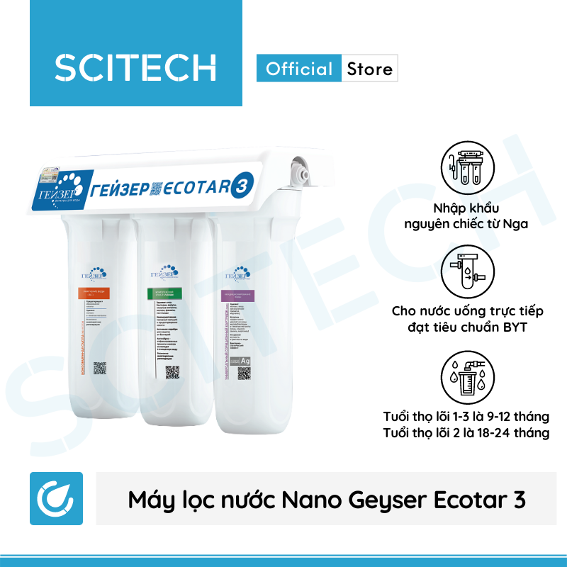 Thương hiệu: Nano Geyser Thời gian thay thế : LÕI 1 VÀ LÕI 2 LÀ 6 THÁNG, LÕI 3 LÀ 24 THÁNG Công nghệ: Nano Geyser Lõi PP.2IN1.GAC : Bông xốp PP có chức năng: Ngăn chặn bụi