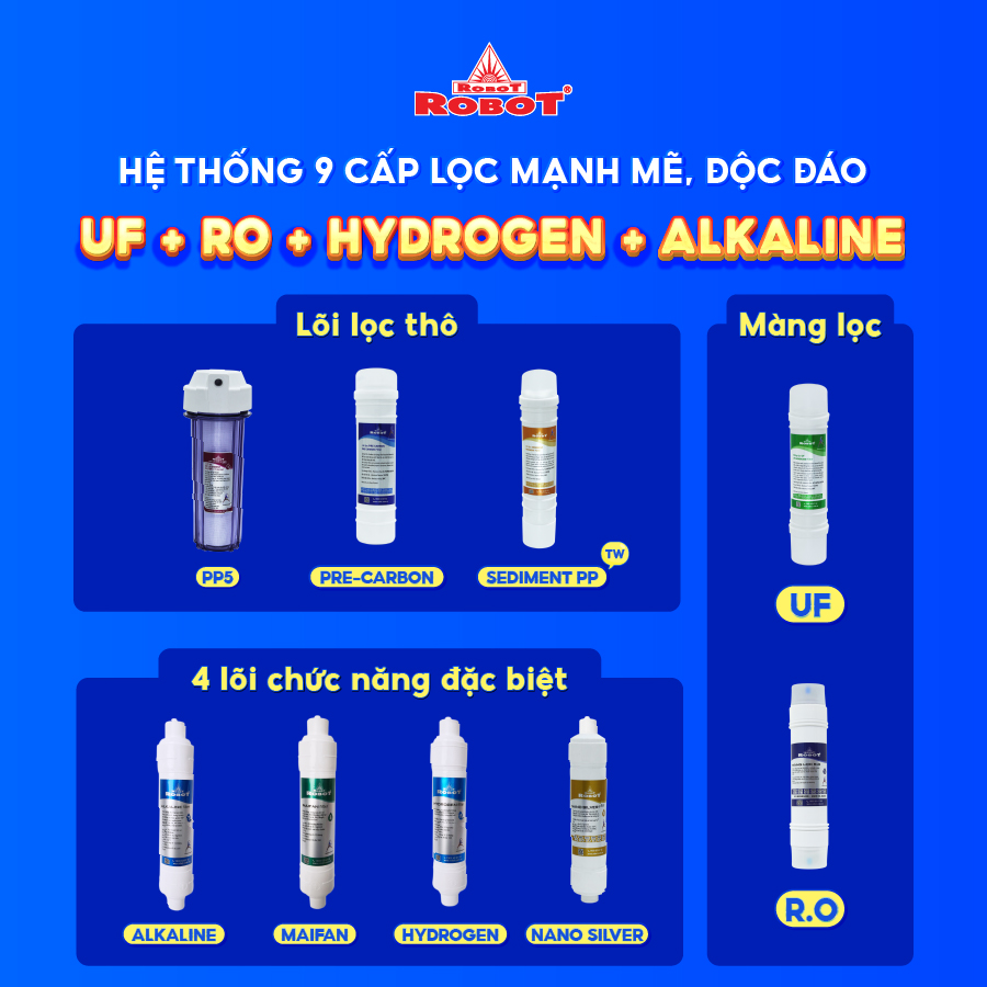 - Máy được tích hợp 2 công nghệ lọc tối ưu nhất hiện nay là UF (Ultrafiltration) & R.O (Reverse Osmosis) cho nguồn nước sau lọc sạch tối đa, được loại bỏ hoàn toàn cặn bẩn hay chất gây hại. Hệ thống đa cấp lọc mạnh mẽ của ROBOT RENO PRO 239GK-UR