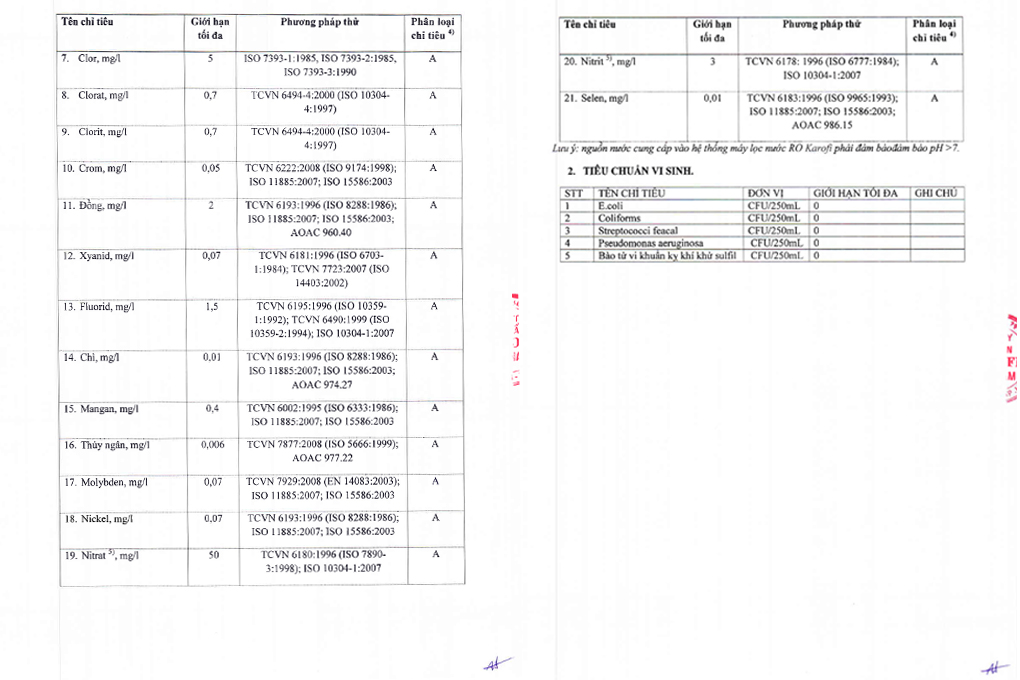 Đạt chuẩn Quốc gia nước uống trực tiếp QCVN6-1:2010/BYT Vượt qua mọi quy trình kiểm tra nghiêm ngặt về chất lượng nước sau lọc và chất lượng dùng trong sinh hoạt gia đình, Karofi là đơn