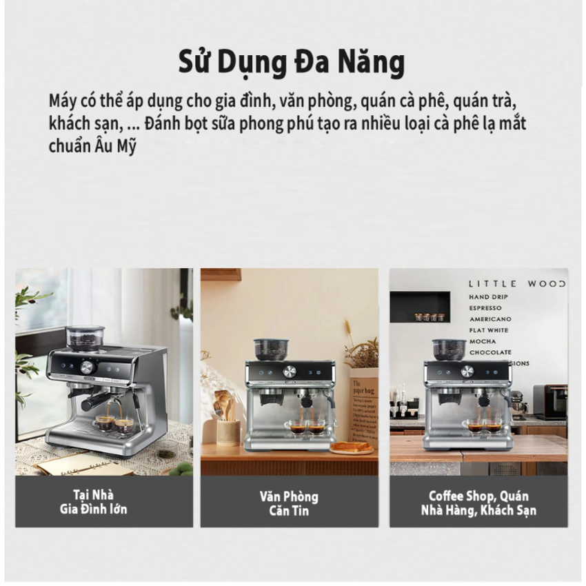 - Pha cà phê espresso, xay hạt, tạo bọt sữa và đồng hồ do áp suất 3 trong 1