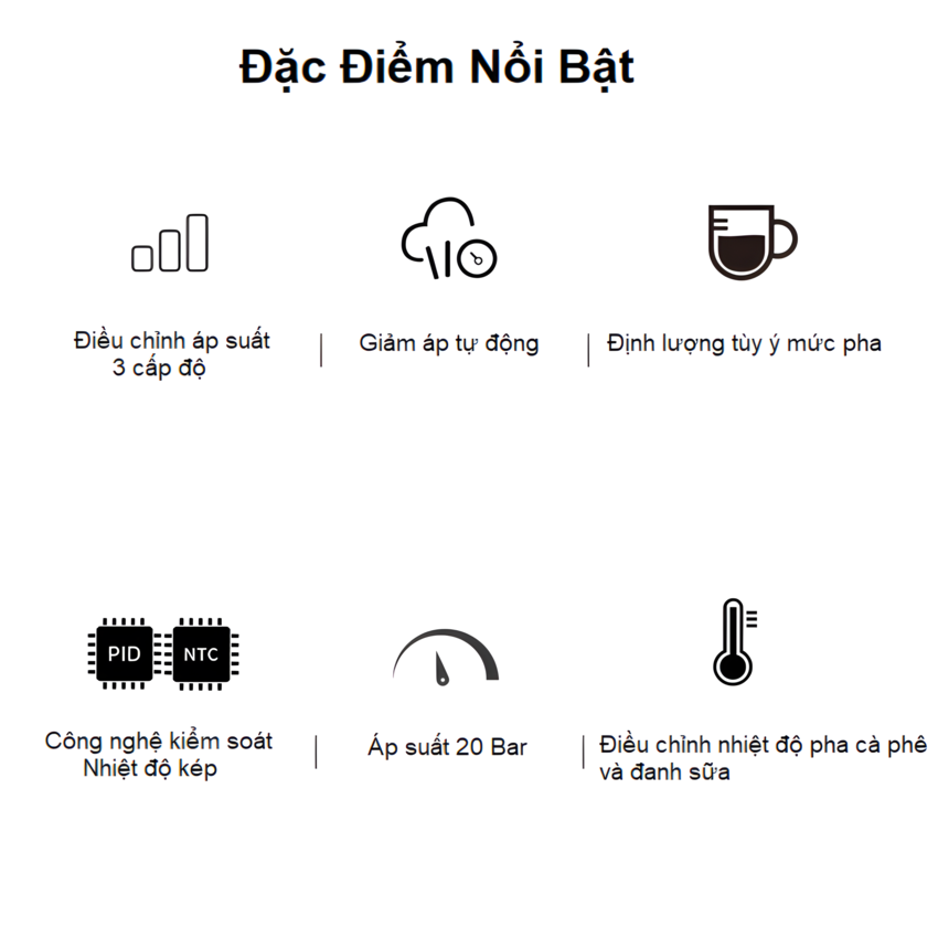 - Chức năng pha cà phê: Cappuccino, Espresso, Latte