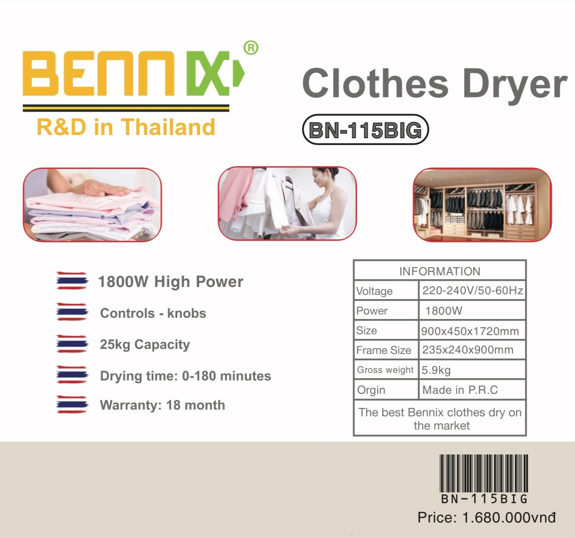 - Máy sấy quần áo là dòng sản phẩm được sử dụng nhiều trong những năm qua đặc biệt đối với miền bắc bởi thời tiết thường nồm và xuất hiện mưa nhiều. trong điều kiện thời tiết này quần áo thường không khô và xuất hiện mùi ẩm mốc Máy sấy quần áo Bennix BN-115BIG là sản phẩm có thể giúp bạn khắc phục được những điều khó chịu này.