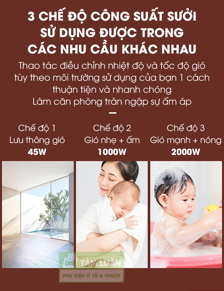 - Máy sưởi ấm phòng ngủ có 3 chế độ công suất: 45w, 1000w, 2000w