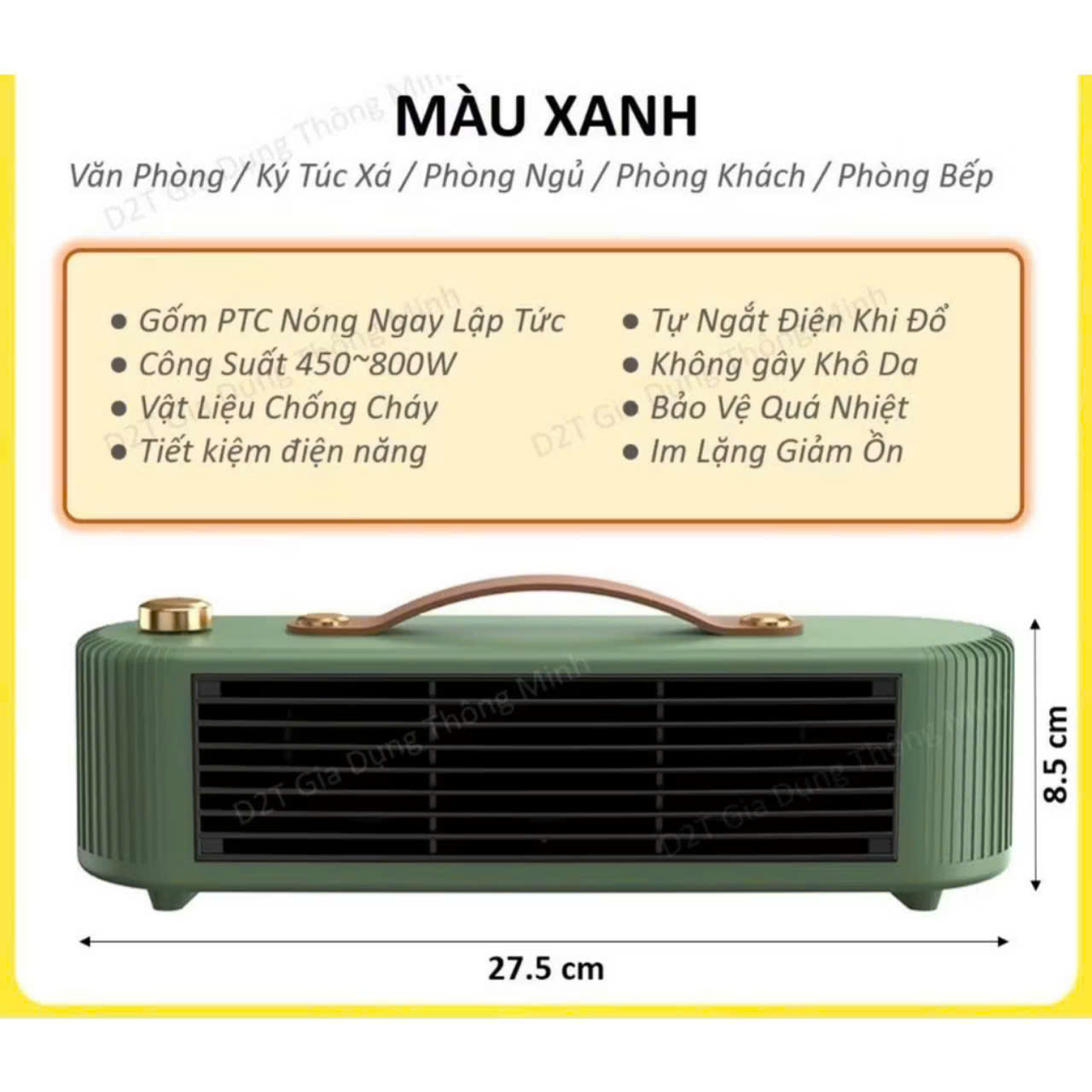 Công suất: 1500W Chế độ hẹn giờ: Tự động tắt máy sau một thời gian cài đặt Chế độ an toàn: Tự động tắt máy khi quá nhiệt hoặc bị đổ Tính năng: Thanh nhiệt PTC giữ nhiệt độ