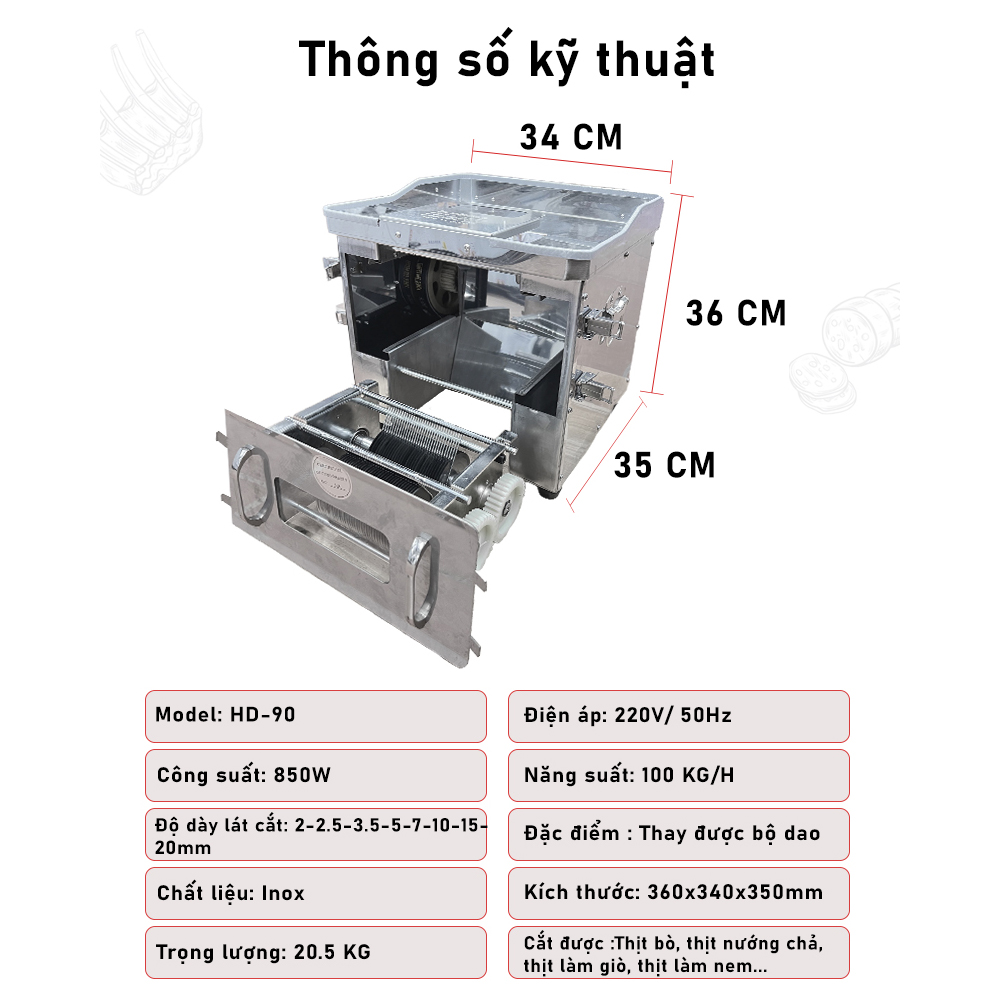 Ngoài khả năng thái được nhiều độ dày mỏng. Máy thái thịt HD-90 có thể thái đa năng nhiều loại thịt như:
