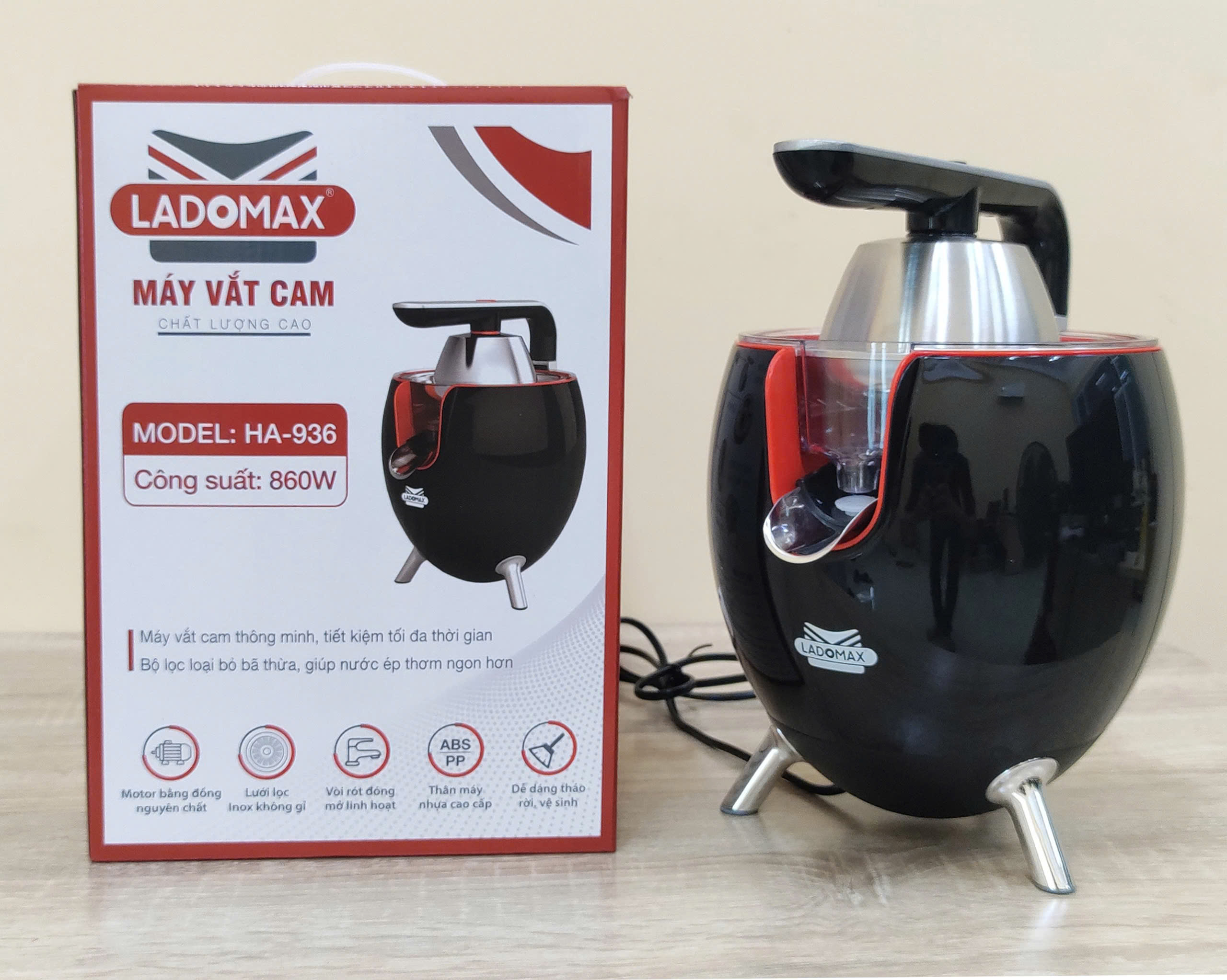 Thông tin sản phẩm Thương hiệu Ladomax chính hãng Máy: Máy vắt cam công nghiệp Công suât: 860W Model : 936 màu đen Điện áp: 220-240V, 50/60HZ Bảo hành
