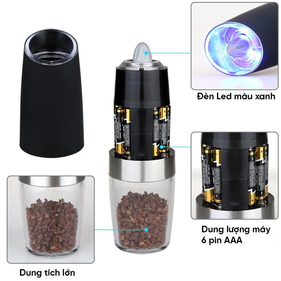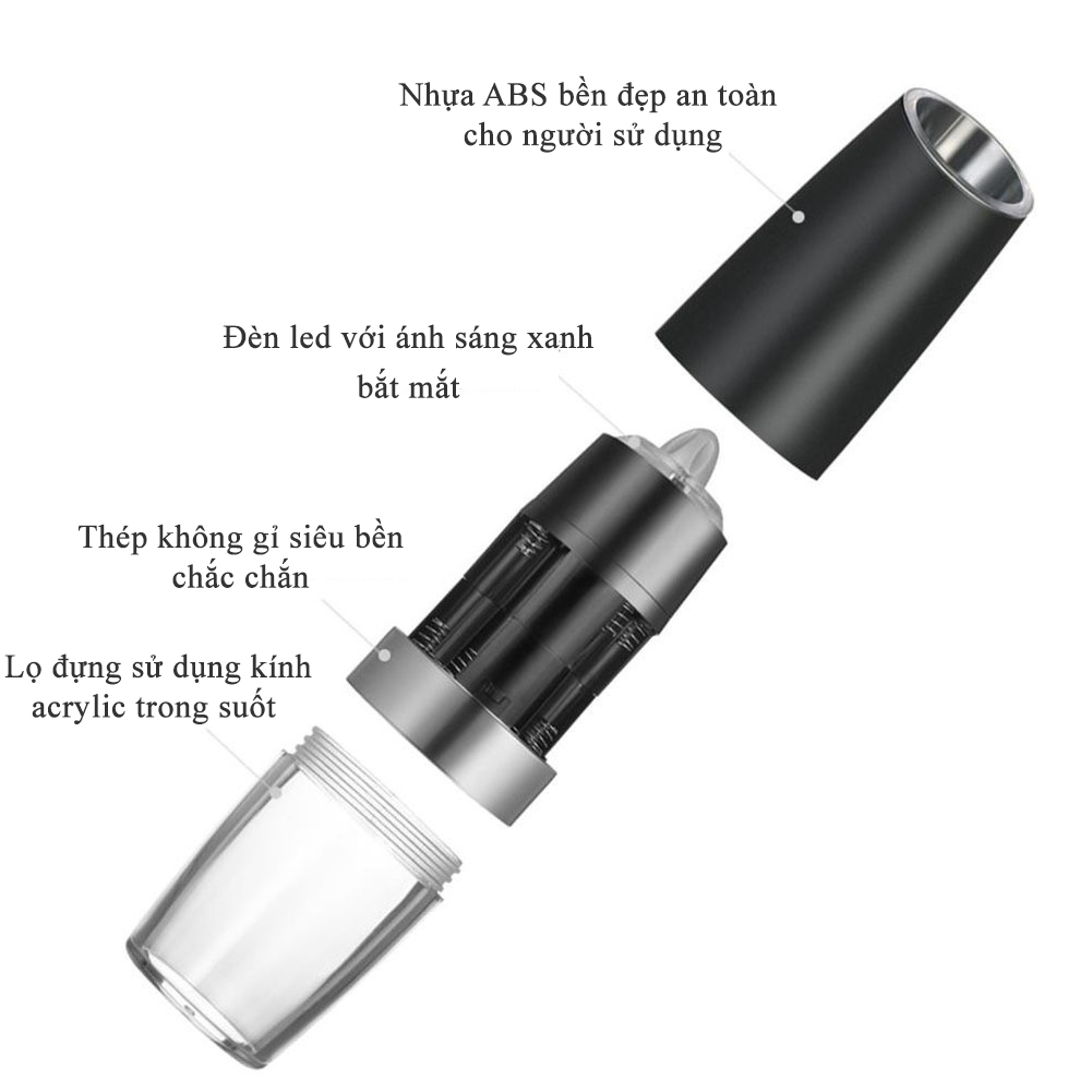 Máy Xay Tiêu Cầm Tay Tự Động Chạy Pin Kunbe - Cối Xay Hạt Gia Vị Có Đèn Led, Lõi Mài Gốm Ceramic Cao Cấp, Tiện Dụng