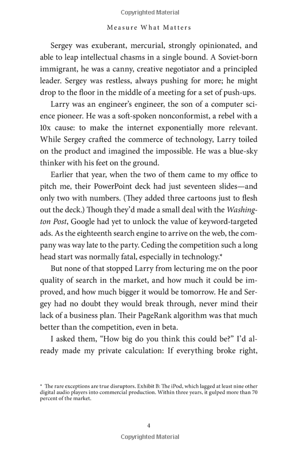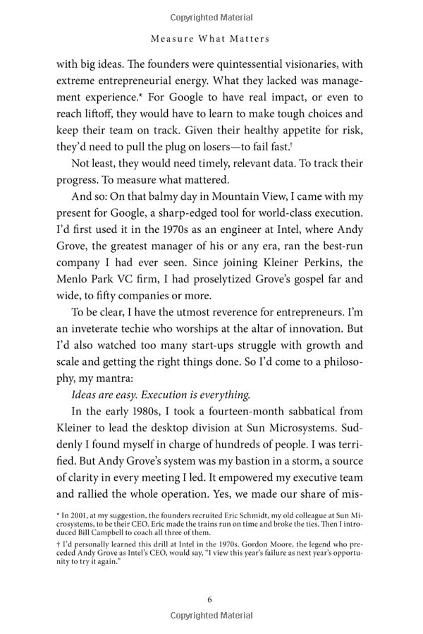INSTANT NEW YORK TIMES BESTSELLER 'I'd recommend John's book for anyone interested in becoming a better manager', Bill Gates 'Management What Matters is a must read for anyone motivated to improve their organization' - Former Vice President Al Gore, chairman of the Climate Reality Project 'Measure What Matters shows how any organization or team can aim high, move fast, and excel' , Sheryl Sandberg, Facebook COO and founder of L and OptionB 'Measure What Matters deserves to be fully embraced by every person responsible for performance in any walk of life' - Jim Collins, author of Good to Great 'In this indispensable book, the most important venture capitalist of our era reveals a key to business innovation and success - Walter Isaacson, author of Steve Jobs and The Innovators 'Measure What Matters takes you behind the scenes for the creation of Intel's powerful OKR system - one of Andy Grove's finest legacies' - Gordon Moore, cofounder and former chairman of Inte -------- The revolutionary movement behind the explosive growth of Intel, Google, Amazon and Uber. With a foreword by Larry Page, and contributions from Bono and Bill Gates. Measure What Matters is about using Objectives and Key Results (OKRs), a revolutionary approach to goal-setting, to make tough choices in business. In 1999, legendary venture capitalist John Doerr invested nearly $12 million in a startup that had amazing technology, entrepreneurial energy and sky-high ambitions, but no real business plan. Doerr introduced the founders to OKRs and with them at the foundation of their management, the startup grew from forty employees to more than 70,000 with a market cap exceeding $600 billion. The startup was Google. Since then Doerr has introduced OKRs to more than fifty companies, helping tech giants and charities exceed all expectations. In the OKR model objectives define what we seek to achieve and key results are how those top priority goals will be attained. OKRs focus effort, foster coordination and enhance workplace satisfaction. They surface an organization's most important work as everyone's goals from entry-level to CEO are transparent to the entire institution. In Measure What Matters, Doerr shares a broad range of first-person, behind-the-scenes case studies, with narrators including Bono and Bill Gates, to demonstrate the focus, agility, and explosive growth that OKRs have spurred at so many great organizations. This book will show you how to collect timely, relevant data to track progress - to measure what matters. It will help any organization or team aim high, move fast, and excel .