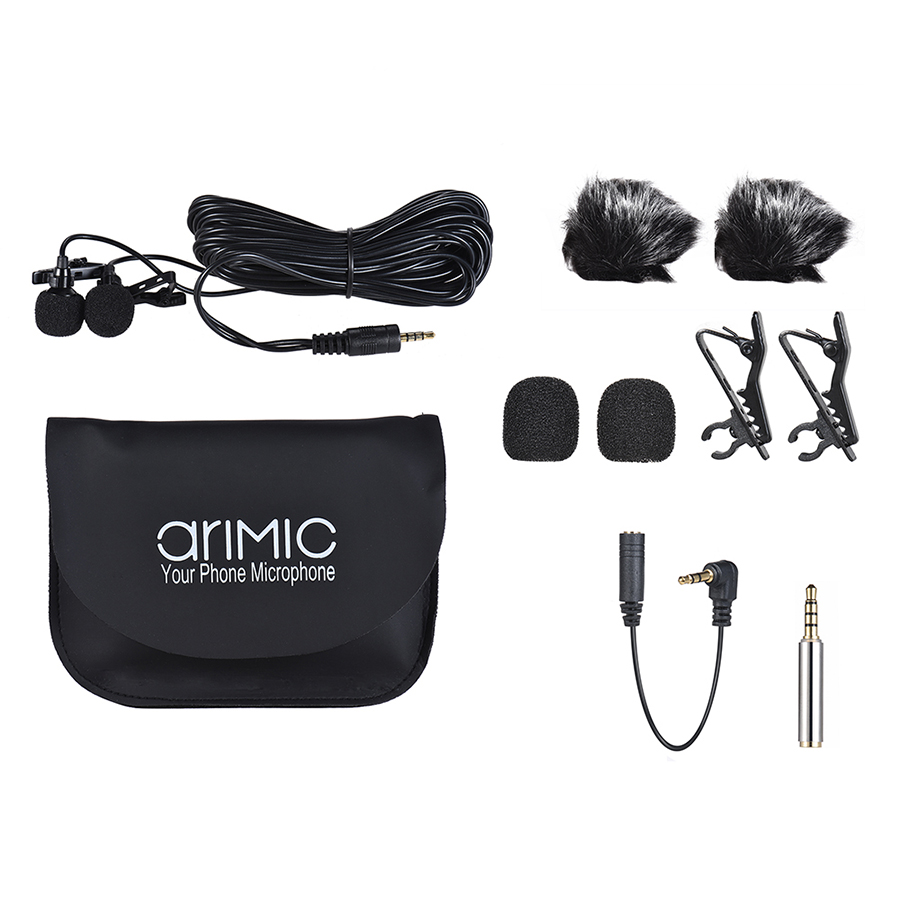 - Cặp Micro Cài Áo Cho Điện Thoại Và Máy Ảnh Arimic Clip-On Dual Lavalier, bao gồm 02 micro thu âm cùng lúc phục vụ cho việc phỏng vấn, làm phim, review sản phẩm. -