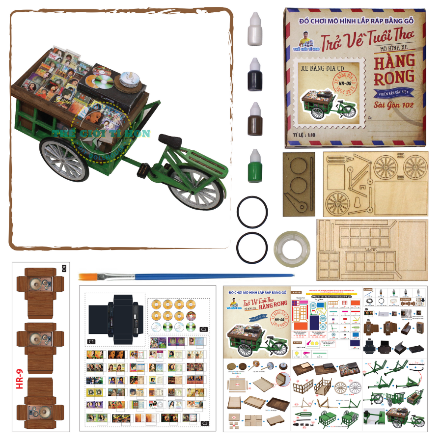 - SẢN PHẨM KHÔNG ÁP DỤNG ĐỔI TÊN BẢNG HIỆU GIÁ SẢN PHẨM CHƯA BAO GỒM THUẾ VAT, KHÁCH CẦN XUẤT VAT XIN VUI LÒNG LIÊN HỆ THẾ GIỚI TÍ HON QUA CHATBOX Mô Hình Sài Gòn Xưa Và Nay Thu Nhỏ - Xe Bán Đĩa Dạo - HR09 ** ĐƠN HÀNG XE HÀNG RONG KHÔNG ÁP DỤNG FREESHIP Cái thời internet còn chưa phát triển, muốn xem một bộ phim hay nghe nhạc… nhanh và sớm nhất chỉ còn cách mua đĩa thôi, thế là ở đất Sài Gòn thời ấy lại rộ lên một nghề mới – Bán đĩa dạo. Trên chiếc xe ba gác nhỏ đầy kín những đĩa nhạc đủ loại cũ mới và những phim hot hit thời đó, cùng với cái thùng loa nhỏ, cái đầu đĩa mini, vậy là đã đủ xịn xò để rong ruổi mưu sinh khắp phố phường Sài Gòn. Mô hình Xe Bán Đĩa Dạo Sài Gòn Thu Nhỏ - HR09 Tìm Hiểu Mô Hình Tí Hon Thông số mô hình Đánh giá độ khó Kích thước sản phẩm 12.0 x 4.0 x 6.0 CM (Dài x Rộng x Cao) Xuất xứ VIỆT NAM Cân nặng 0.2 Kg Nguyên vật liệu Gỗ, hoa cỏ khô, vải, giấy, kim loại, đèn Led, gốm sứ,nhựa,... Sản phẩm bao gồm Hộp Pin có công tắt, nguyên vật liệu lắp ráp, sách hướng dẫn. Phụ kiện làm mô hình (Mua riêng): Keo chuyên dụng + Mica Che Bụi + Bộ dụng cụ Kit...() Shop hỗ trợ lắp ráp luôn nếu bạn có nhu cầu (có phụ phí)