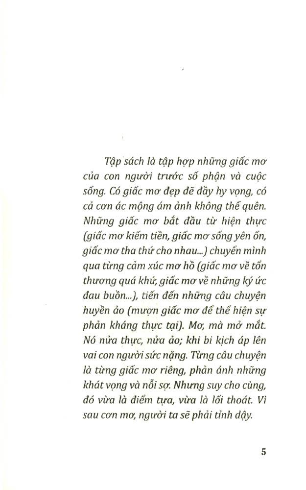 Tập sách là tập hợp những giấc mơ của con người trước số phận và cuộc sống. Có giấc mơ đẹp đẽ đầy hy vọng, có cả cơn ác mộng ám ảnh không thể quên. Những giấc mơ bắt đầu từ hiện thực (giấc mơ kiếm tiền, giấc mơ sống yên ổn, giấc mơ tha thứ cho ) chuyển m.ình qua từng cảm xúc mơ hồ (giấc mơ về tổn thương quá khứ, giấc mơ về những ký ức đau buồ), tiến đến những câu chuyện huyền ảo (mượn giấc mơ để thể hiện sự phản kháng thực tại). Mơ, mà mở mắt. Nó nửa thực, nửa ảo; khi bi kịch áp lên vai con người sức nặng. Từng câu chuyện là từng giấc mơ riêng, phản ánh những khát vọng và nỗi sợ. Nhưng suy cho cùng, đó vừa là điểm tựa, vừa là lối thoát. Vì sau cơn mơ, người ta sẽ phải tỉnh dậy.