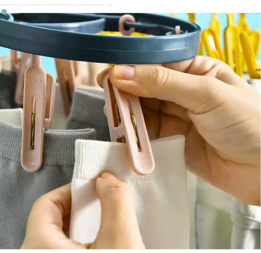 Móc chùm treo quần áo có thể xoay 360 độ, móc giữ cố định không lo bị gió thổi bay.